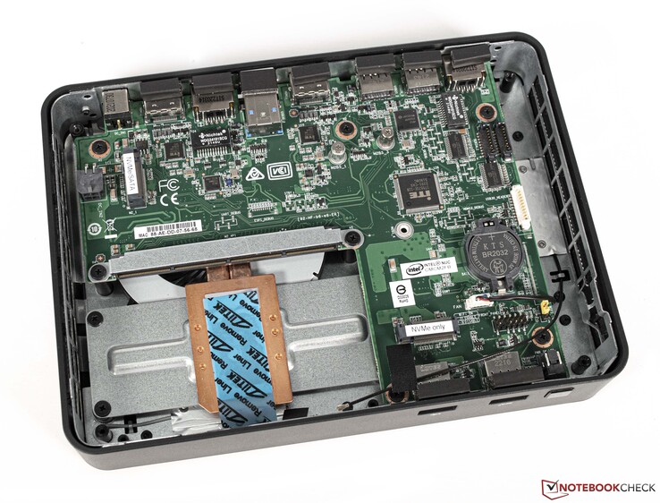 La opción barebone facilita la apertura del elemento de chasis Intel NUC Pro. La placa base se fija con cuatro tornillos. En el interior, se puede acceder fácilmente a las interfaces necesarias para equipar el dispositivo con lo más esencial. El elemento de cómputo tiene su lugar en el área frontal. Además, ya se ha aplicado una almohadilla de conducción del calor para garantizar la disipación del mismo. Además, hay que conectar las dos antenas WLAN, que también están preinstaladas. Se pueden instalar hasta dos SSD M.2 para el almacenamiento masivo.