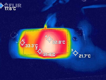 Mientras que las asas del Zotac Zone siempre se mantienen frescas, la pantalla táctil y la parte trasera pueden calentarse considerablemente bajo carga. Las temperaturas en las piezas de plástico nunca alcanzan valores alarmantes, pero la pantalla táctil de cristal alcanza una temperatura de hasta 50 °C, lo que hace que las entradas prolongadas resulten incómodas.