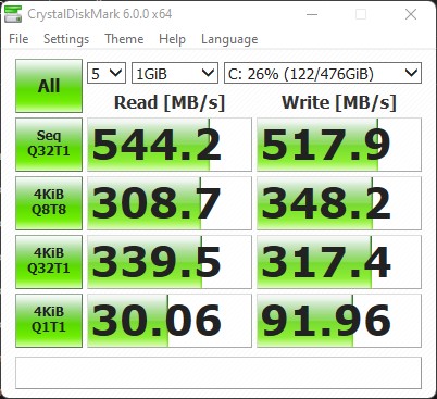 Nuestro modelo de pruebas está equipado con un SSD de 512 GB de almacenamiento, del que no conocemos más detalles. El SSD instalado usa la interfaz M.2-2280 y ofrece velocidad SATA, lo que pudo verse en los resultados. Su desventaja respecto a los SSDs NVMe más rápidos se hizo claramente visible. No obstante, pudimos observar un rendimiento de lectura 4K relativamente bueno en nuestra prueba, lo que resultó ser una ventaja al cargar muchos archivos pequeños. El SSD instalado está equipado con un pequeño refrigerador. Esto parece ser efectivo, ya que el rendimiento continuo del SSD se mantuvo muy constante. En total, el ACEMagician ACE-CK10-8259U puede equiparse con hasta tres SSD (2x M.2-2280, 1x 2,5 pulgadas).