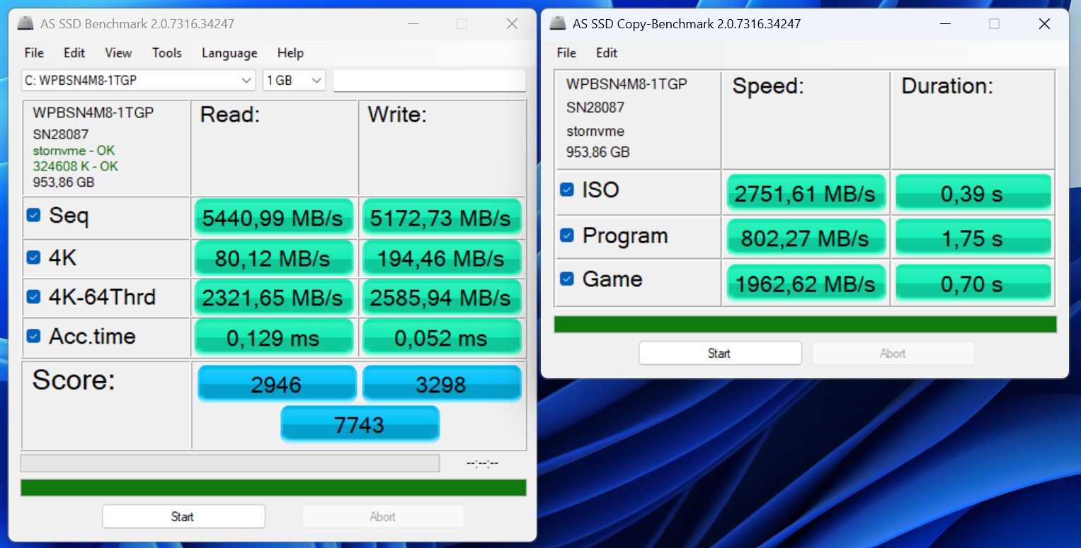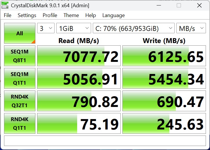 El Geekom A7 Max utiliza una unidad SSD de 1 TB con conexión PCIe 4.0, que alcanza velocidades de transferencia decentes, si no sobresalientes. Sin embargo, para las tareas cotidianas y las cargas de trabajo productivas, el rendimiento de almacenamiento ofrecido es fácilmente suficiente. La refrigeración de la unidad está diseñada de tal forma que el rendimiento se mantiene estable incluso bajo cargas prolongadas.