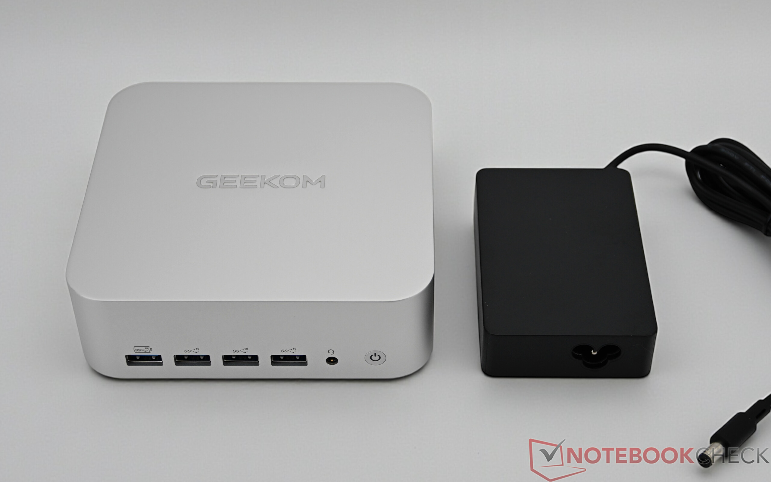 La Geekom A7 Max utiliza la misma carcasa de mayor tamaño que la A8 Max o la A9 Max, lo que la distingue claramente de los modelos anteriores. No obstante, Geekom ha optado por la carcasa de aluminio, de uso frecuente, lo que significa que todas las ventajas y desventajas siguen siendo las mismas. La fabricación es de alta calidad y se corresponde con el rango de precios. Con un peso de unos 681 gramos, el mini PC sigue siendo más ligero que algunos modelos de la competencia a pesar de su tamaño, mientras que la compacta fuente de alimentación de 256 gramos apenas se nota.