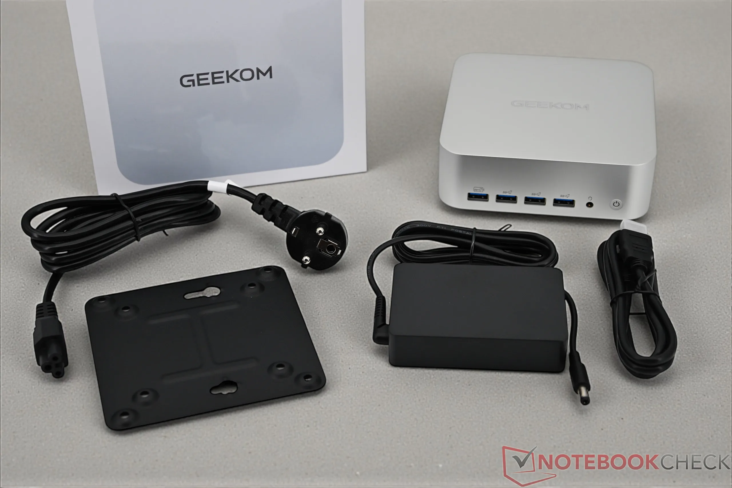 La caja del Geekom A7 Max contiene un cable HDMI y un soporte VESA además de la fuente de alimentación de 120 vatios. Un breve manual completa el volumen de suministro y explica las conexiones disponibles, así como la instalación de la RAM y el almacenamiento masivo.