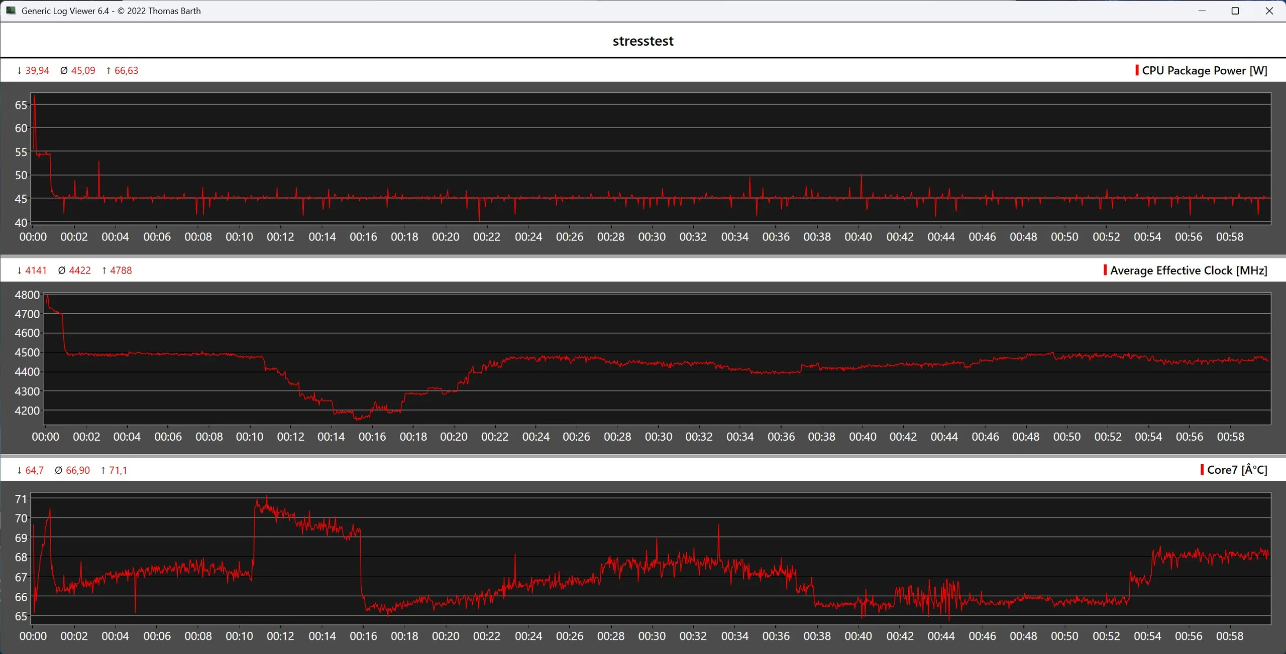 La carcasa del Geekom A7 Max se mantiene agradablemente fría tanto en modo inactivo como bajo carga. En la prueba de estrés, el AMD Ryzen 9 7940HS instalado alcanza brevemente temperaturas de unos 71 °C, lo que no es crítico. El sistema de refrigeración puede disipar de forma fiable el TDP aplicado permanentemente de 45 vatios.