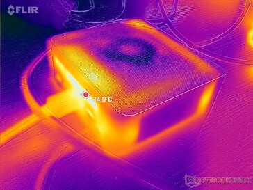 El aire frío entra por los laterales y la malla superior, mientras que el aire caliente sale por la parte trasera, como muestran los mapas de temperatura que aparecen a continuación. El punto caliente de la parte trasera puede alcanzar los 47 C cuando se ejecutan aplicaciones exigentes. No se recomienda colocar ningún objeto encima de la unidad, de lo contrario se reducirá el flujo de aire.