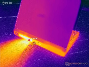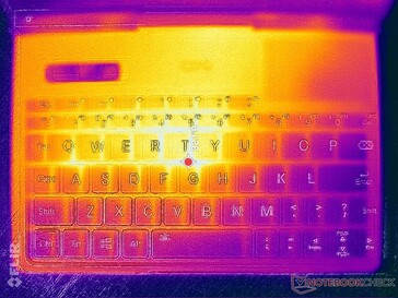Las temperaturas de la superficie son sorprendentemente razonables a pesar de la CPU de alto rendimiento y el pequeño factor de forma. Los puntos calientes alcanzan unos 36 C tanto en el teclado como en la superficie inferior, en comparación con los más de 40 C del Pocket 3 saliente. Sin embargo, el rendimiento por debajo de la media de la CPU mencionado anteriormente puede estar contribuyendo a que las temperaturas de la superficie sean más bajas de lo esperado.