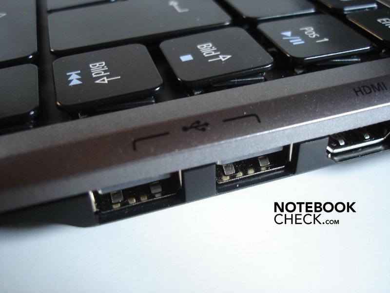 Pasemos ahora a las opciones de conexión e interfaces, con los que el Aspire 3810T llega a un espectro medio por su tamaño de 13.3 pulgadas. Excepto para el LED de estado central ancho, que comienza a parpadear en naranja con la batería baja, no hay puertos en absoluto en la parte frontal. La parte posteriorno tiene más posibilidades de conexion, que no es una sorpresa porque la batería ocupa casi todo el ancho.