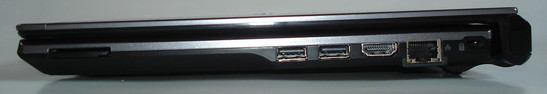 En el lateral derecho, sin embargo, encuentras en conector de corriente, una salida VGA, un USB 2.0 y las obligatorias entrada de micrófono y salida de auriculares (con soporte SPDIF) mientras que la anterior sirve como linea de entrada o linea de salida respectivamente. Concluyendo en el lateral derecho, un cierre Kensington, un puerto LAN gigabit RJ45, una salida HDMI con soporte HDCP, dos puertos adicionales USB 2.0 y un lector de tarjetas 5 en uno (SD, MMC, Memory Stick, Memory Stick Pro, xD).