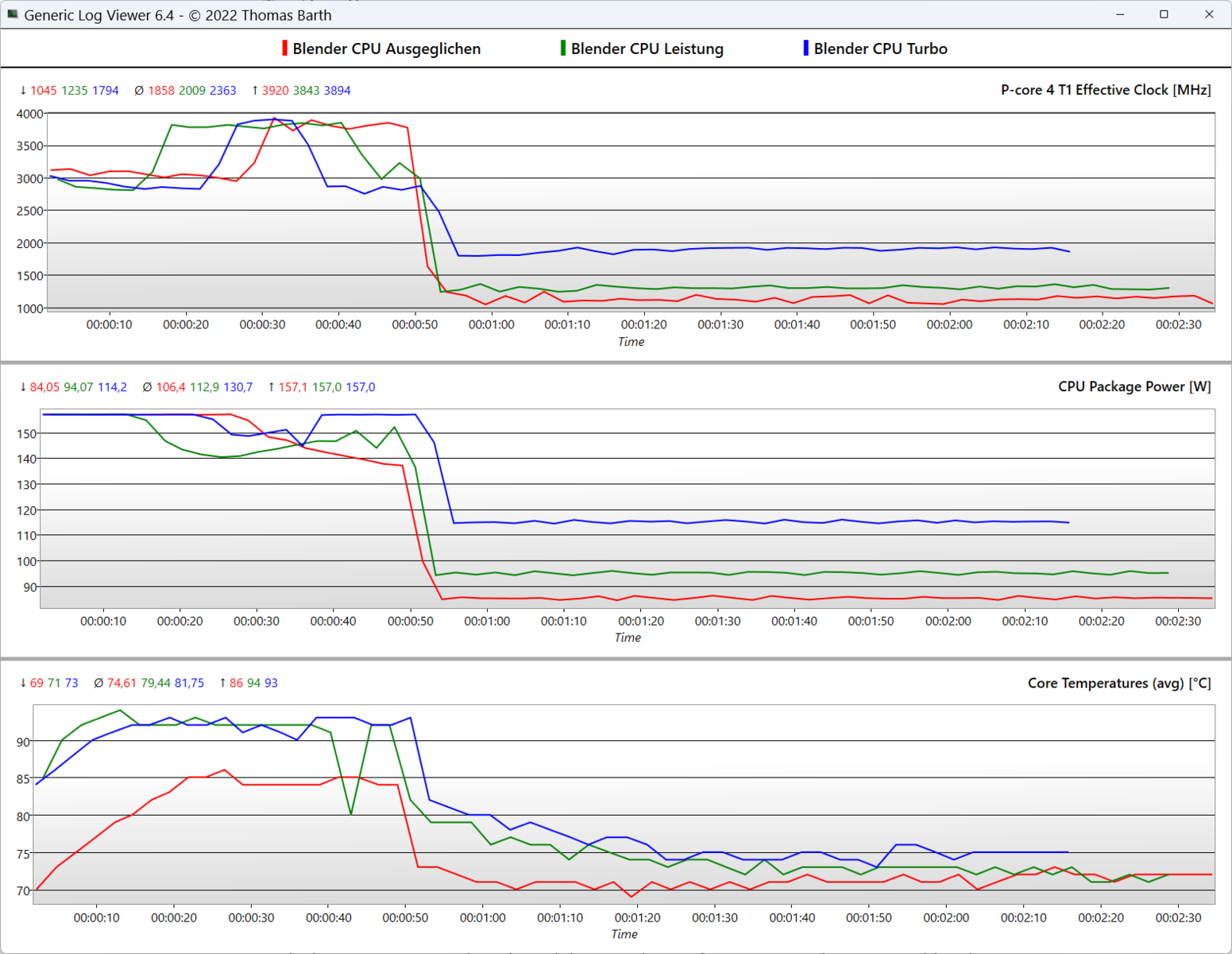 En la prueba de estrés (FurMark + Prime95), tras un minuto, la velocidad de reloj de los núcleos P cayó de 3,6 GHz a sólo 0,85 GHz, muy por debajo de la velocidad de reloj base de 2,1 GHz. Al activar el modo turbo y los "ventiladores al máximo", la velocidad de reloj no bajó hasta pasados 3 minutos (a ~1,1 GHz). La CPU se calienta hasta los 86 °C (y 83 °C, respectivamente) y consume continuamente 100 vatios.