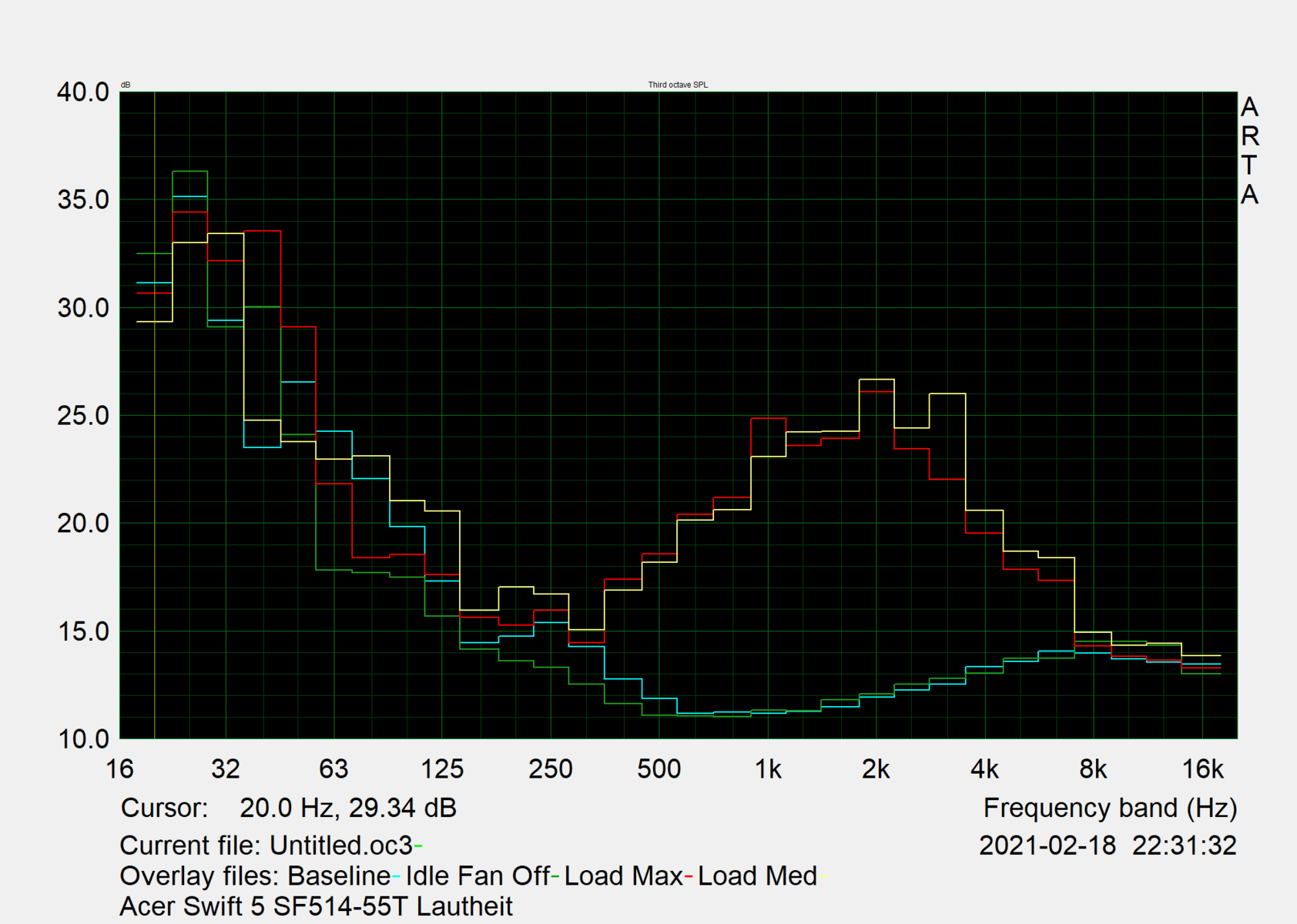 Durante nuestra prueba de carga constante de aproximadamente una hora de duración, las temperaturas en el interior del Swift 5 SF514 se elevaron hasta 97 °C (207 °F). Hasta el final de la prueba, el sistema de refrigeración las redujo a un valor medio de unos 60 °C (140 °F), y las velocidades de reloj fueron inferiores a la velocidad de reloj básica a una media de 1,5 GHz. Sin embargo, el sistema pudo seguir funcionando sin problemas. Dado que una carga como la de nuestro test de estrés es casi imposible en el funcionamiento diario, los usuarios no tienen que esperar ninguna limitación debido a que las temperaturas sean demasiado altas