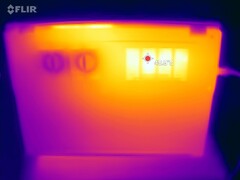 Al jugar, el portátil no alcanza los 40 °C ni siquiera en los puntos calientes. En la prueba de estrés, sin embargo, medimos un máximo de 45 °C en la parte inferior en la zona central y derecha hacia la pantalla cuando se ve desde abajo. En general, el dispositivo se calienta más en el lado izquierdo cuando se mira desde arriba, pero nunca llega a estar incómodamente caliente ni siquiera en las teclas.