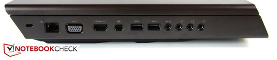 Tres puertos de vídeo (VGA, HDMI 1.4, Mini-DisplayPort) y cuatro conectores de audio (5.1 analog, 7.1 digital per S/PDIF) son también loables. Además, hay un lector de tarjetas 9-en-1, una ranura express card (54mm) y un Bloqueo Kensington. Un puerto RJ-45 Gigabit LAN no puede faltar tampoco, por supuesto. Uno puede incluso usar el display del portátil para otros dispositivos a través de la entrada HDMI integrada. Aparte de la toma de corriente, todas las interfaces están en los laterales.