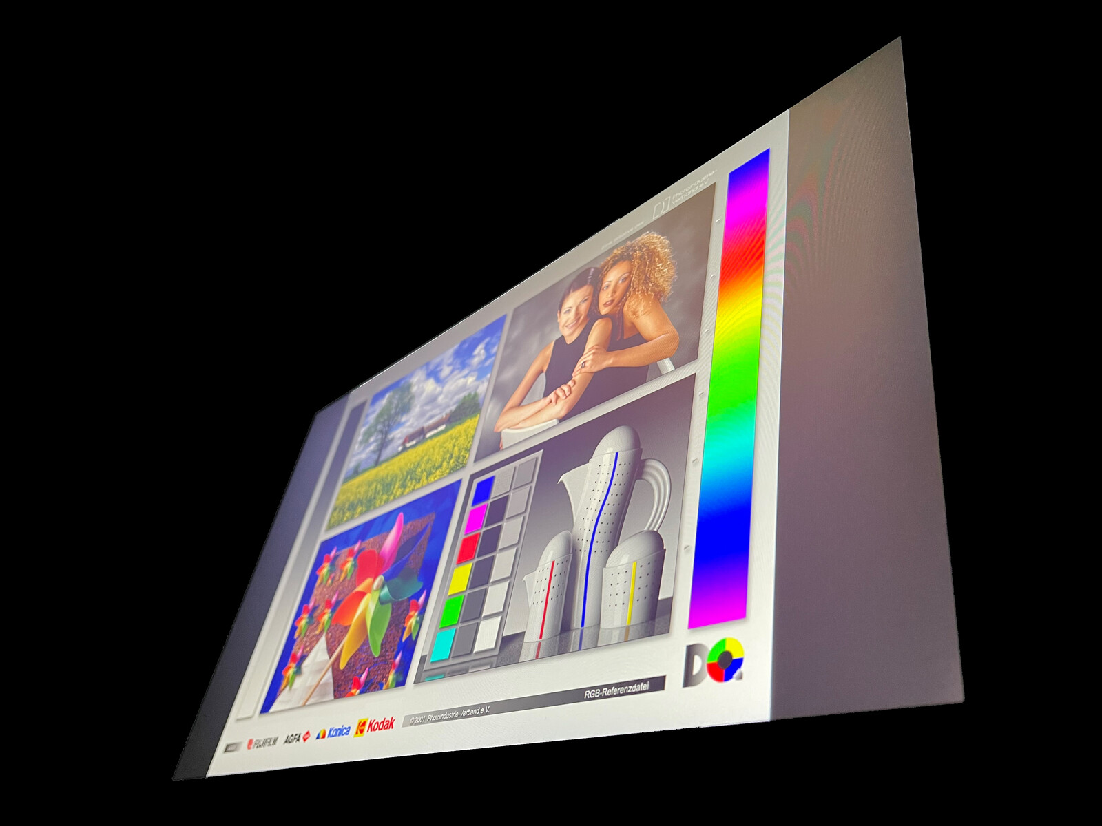 Gracias al muy buen nivel de negro de sólo 0,19, el contraste de 1.605:1 es aproximadamente un 30% mayor que en los dispositivos de comparación. La desviación de color Delta E y los valores de escala de grises de 1,31 y 2,3 respectivamente son excelentes incluso antes de la calibración, y también están en el rango óptimo (Delta E < 3). Según nuestra medición independiente, la pantalla cubre el 94% y el 72% de los espacios de color sRGB y AdobeRGB, respectivamente
