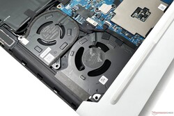 La disposición interna no ha cambiado desde el año pasado, lo que también significa que una vez más hay que aguantar la RAM soldada. El SSD NVMe, la tarjeta Wi-Fi Killer, y la batería de 87 WHr pueden reemplazarse si es necesario.