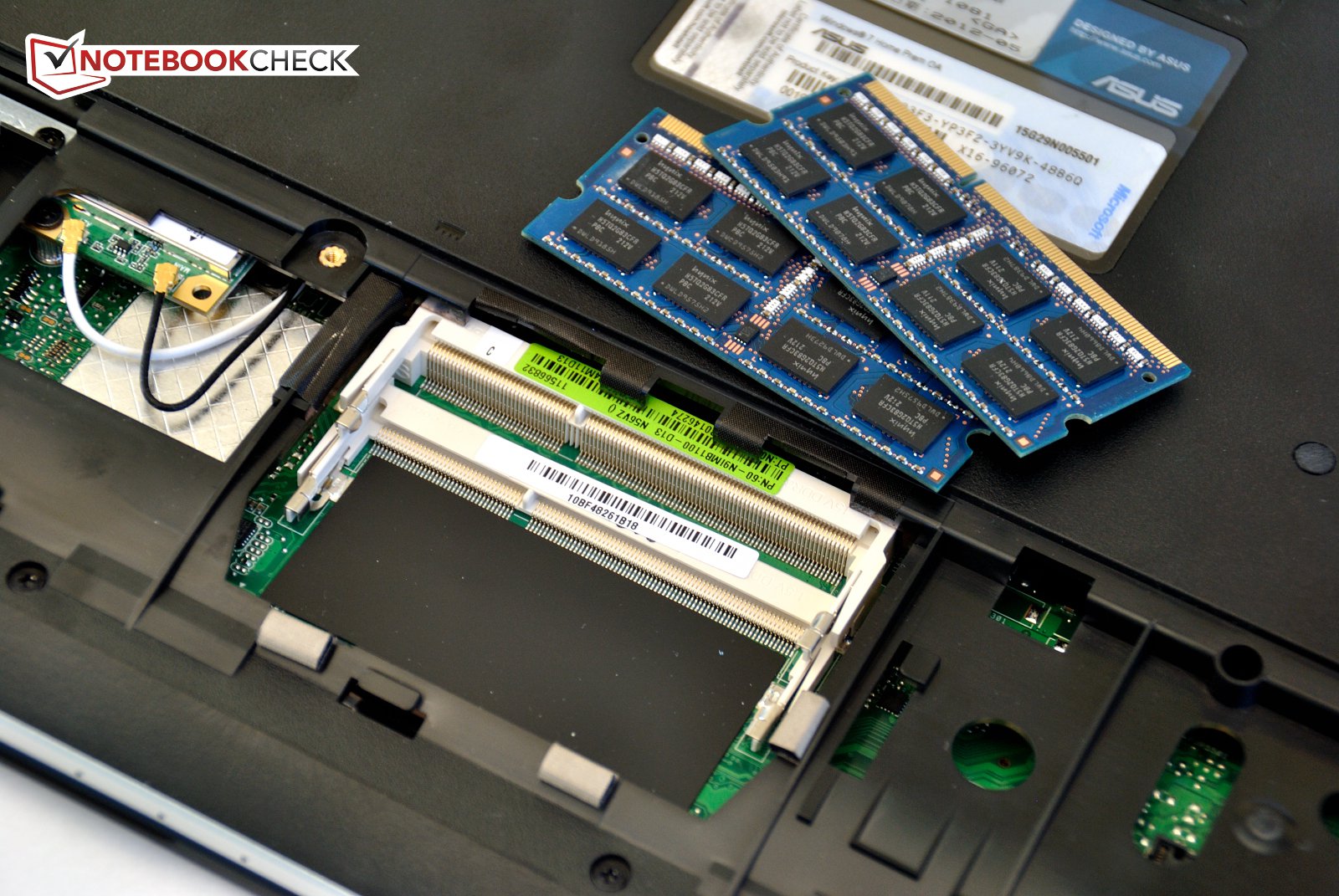 Aparte de la batería intercambiable, la pestaña de servicio se abre fácilmente. Debajo se hayan dos ranuras de RAM llenas con dos módulos de 4GB y el disco duro. El disco duro, asegurado con cuatro tornillos, es fácil de reemplazar. Por desgracia sólo hay una bahía de 2.5" en una carcasa que parece lo bastante grande como para que tuviera dos. El sistema de ventilación no es fácilmente accesible para limpiarlo; hay que retirar todo el panel inferior de la unidad base para hacerlo.