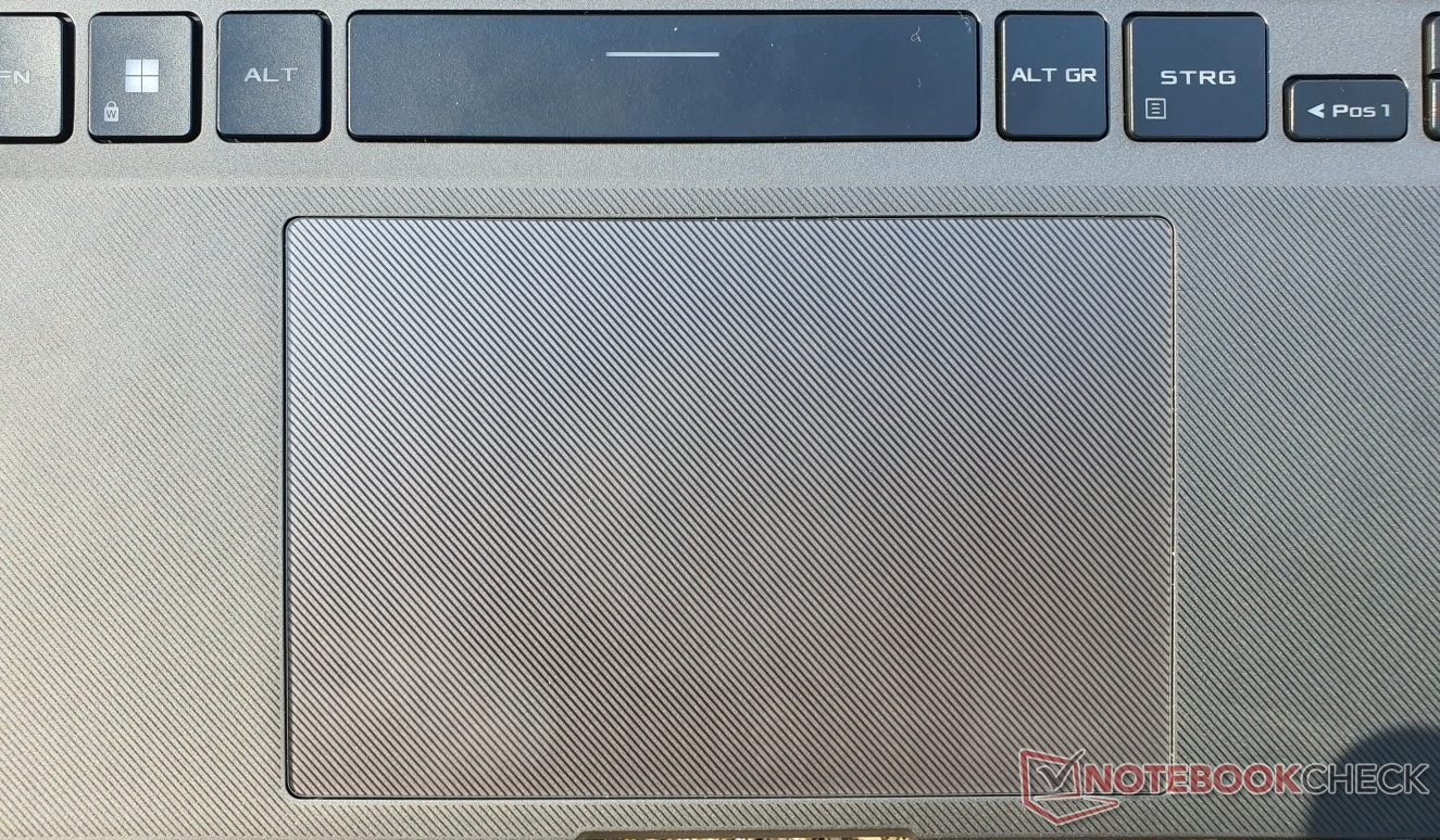 La fabricación es de alto nivel, la unidad de base no se puede torcer y la pantalla tampoco deja mucho espacio para la torsión. Desde el punto de vista táctil, las superficies ligeramente rugosas se sienten muy bien. El patrón de la tapa también se replica de forma exclusivamente óptica en el reposamanos, incluyendo el touchpad. Las huellas dactilares son inmediatamente visibles, pero se espera que la versión final del Flow X16 no adopte el patrón ondulado, sino que utilice un recubrimiento especial para mantener las huellas a raya.