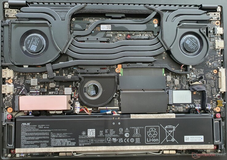 hay que aflojar 13 tornillos Phillips para retirar la placa base de plástico. Además, hay que aflojar algunos clips con una espátula o un pico. En el interior nos esperan tres ventiladores (1 de la CPU, 1 de la GPU y 1 del sistema) que se pueden limpiar. La batería está atornillada y, por lo tanto, puede ser reemplazada.
