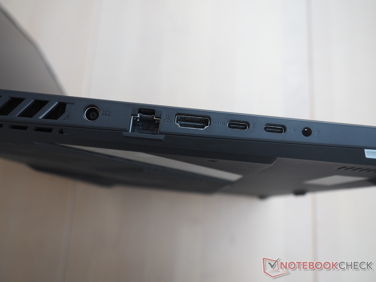 Si se prescinde del lector de tarjetas ausente, la selección de puertos es impresionante. Empezando por el lado izquierdo, encontramos la toma de corriente, un puerto RJ45, una salida HDMI 2.1, una toma de audio combinada y dos puertos USB-C (1x USB 3.2 Gen2, 1x USB 4) que incluyen Power Delivery y soporte DisplayPort. En el lado derecho, tenemos dos puertos tipo-A clásicos que están diseñados según el estándar 3.2-Gen2. Como los puertos están situados en la zona media de las superficies laterales, esto puede llevar a restringir el movimiento cuando se conecta a un ratón externo.