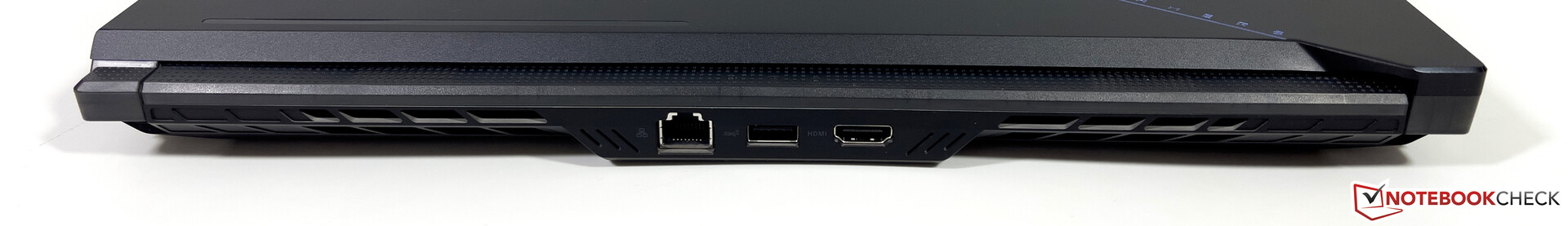 La zona trasera de la unidad base está casi completamente ocupada por la refrigeración, por lo que sólo hay tres puertos (Ethernet, HDMI, USB-A) en el centro de la parte trasera. La mayoría de los puertos restantes se encuentra en la parte delantera del lado izquierdo, que es también el caso para el conector de alimentación en ángulo. El cable de la fuente de alimentación es bastante corto, por lo que el cable de alimentación puede bloquear el puerto USB-A dependiendo de la orientación. Hay otro puerto USB-C en el lateral izquierdo.