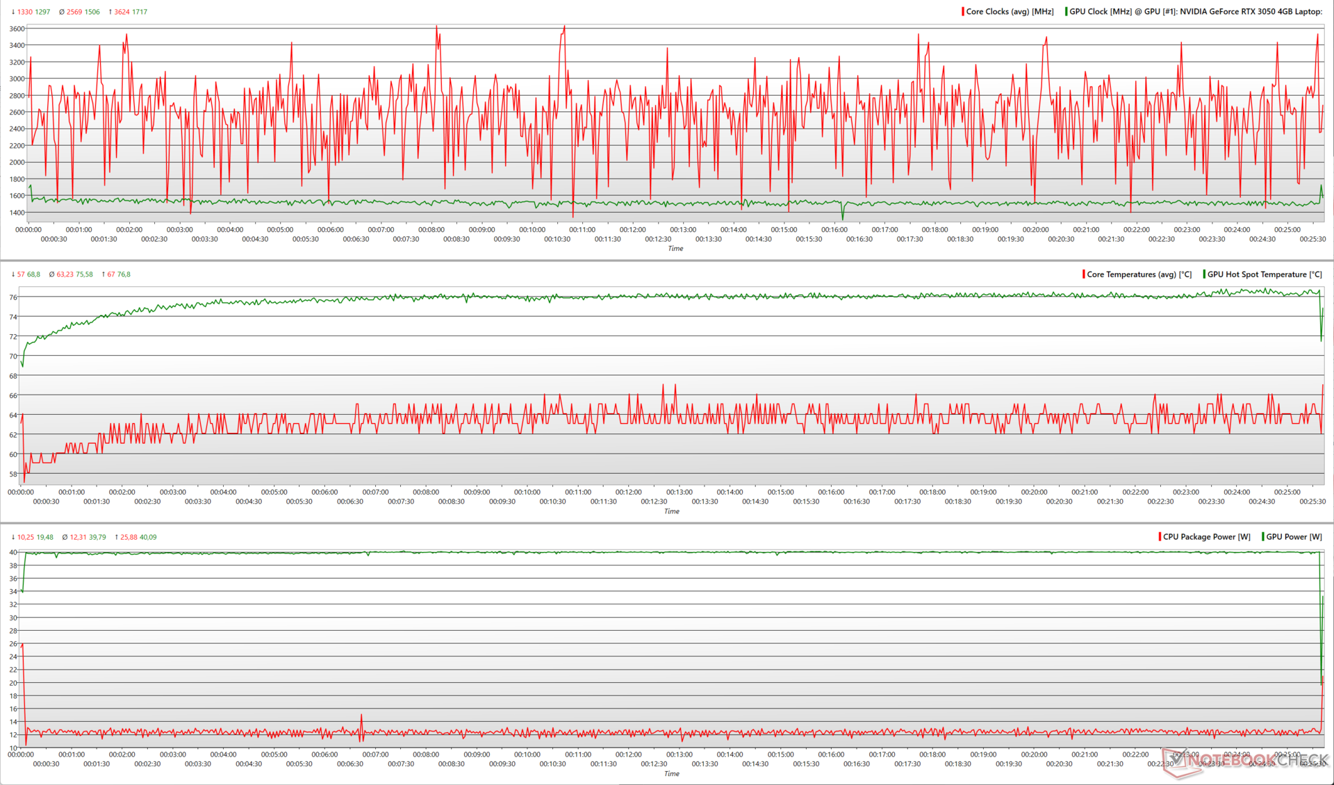 Si añadimos FurMark a la mezcla, el pico de potencia de la CPU cae hasta los 48,6 W y se mantiene en 22 W. La RTX 3050 muestra frecuencias medias de 1.192 MHz con un consumo de energía constante de 34 W.