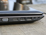 Solo hay tres puertos USB 2.0. Los dos puertos a la izquierda están situados muy juntos, sin embargo. Unidades flash grandes o conectores anchos bloquearan la conexión de dispositivos en el USB vecino. La posición del USB a la derecha es muy correcta. El puerto USB se situa hacia la parte posterior a la derecha y es muy adecuado para conectar un hub USB y conectar otros dispositivos de forma que no debería impedir la conexión de otros dispositivos -estando tan hacia atrás como está. En combinación con los dos USB's facilmente accesible a la izquierda, es muy sencillo conectar un gran numero de dispositivos USB ocupando el menor espacio posible.