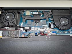 La tapa inferior de la carcasa está fijada con tornillos Torx (T5) y puede retirarse. A continuación, puede limpiar los ventiladores y sustituir tanto la SSD M.2 2280 como la batería atornillada si es necesario. Un vistazo al sistema de refrigeración muestra que uno de los dos ventiladores no está conectado al tubo de calor. Pero volveremos sobre esto más adelante.
