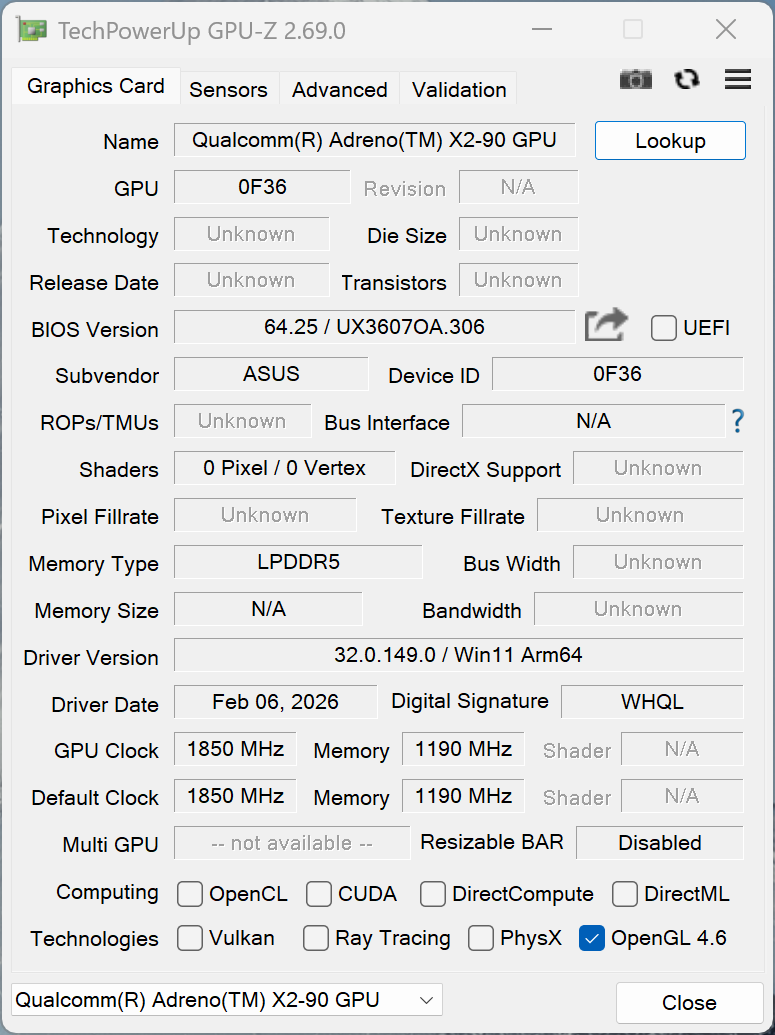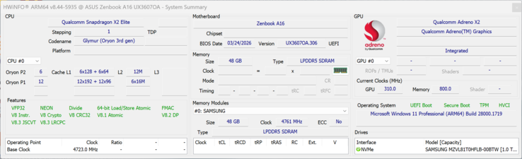 | Asus Zenbook A16 UX3607 Qualcomm Snapdragon X2 Elite Extreme X2E-94-100 ⎘ Qualcomm Adreno X2-90 ⎘ 48 GB Memoría, 1000 GB SSD | 1.2 kg | 16.5 mm | 16.00" 2880x1800 212 PPI OLED | ||