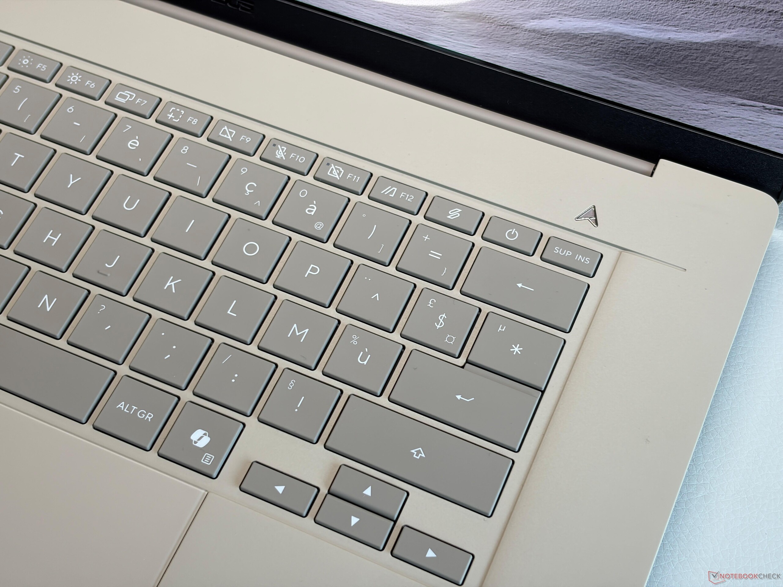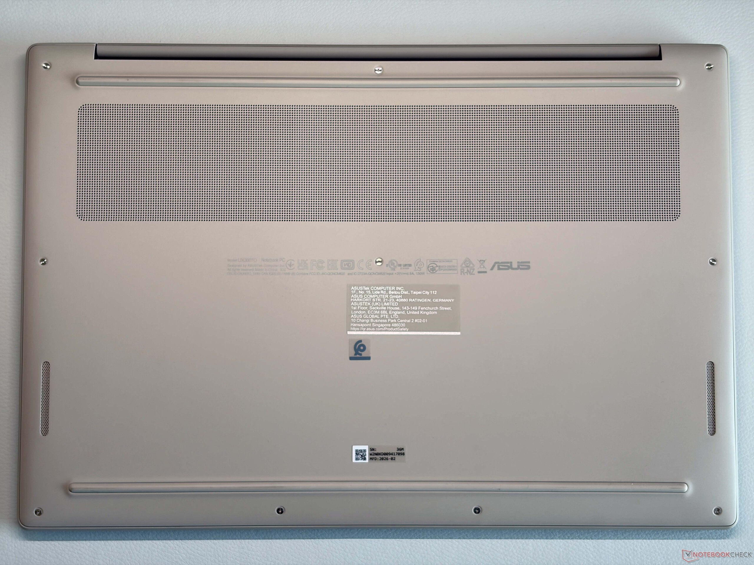 El diseño del chasis sigue el del Zenbook A14 más pequeño y el Zenbook A16 de 16 pulgadas también está disponible en los conocidos colores Gris Islandia o Beige Zabriskie. En comparación con el Zenbook S16 alimentado por AMD, la unidad base es más redondeada y la diferencia de peso total es muy notable con más de 300 gramos. Asus utiliza su material de ceraluminio para la construcción del chasis y aunque el A16 es un dispositivo muy ligero, sigue siendo muy estable y robusto e incluso se siente un poco más denso en comparación con el Zenbook A14 más pequeño (menos de 1 kg). No hay ruidos chirriantes y la estabilidad de la unidad base es excelente. La tapa es un poco más flexible, pero esto no supone ningún problema. Nos hubiera gustado ver una mejor calibración de las bisagras (ángulo máximo de apertura ~135 grados), porque la tapa se tambalea un poco.