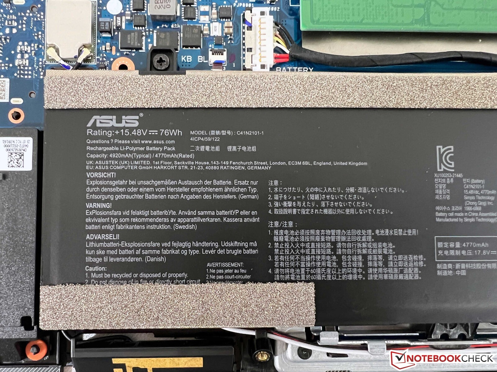 Asus usa un chasis de metal y tanto la unidad base como la tapa de la pantalla son extremadamente estables y resistentes a la torsión. La unidad base también parece bastante delgada, lo que es posible gracias a los laterales cónicos. Esto contrasta con elApple MacBook Pro 14por ejemplo, en el que la unidad base parece muy voluminosa, aunque en realidad es más delgada que el Zenbook. Definitivamente no es un portátil extremadamente delgado, pero esto no es un punto de crítica en vista de los potentes componentes.