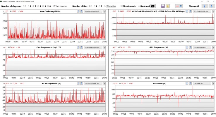 La tarjeta gráfica se estabiliza en torno a los 75 vatios en el test de estrés y se mantiene en este valor. El procesador es un poco más errático y suele rondar los 35 vatios con constantes picos cortos al alza.