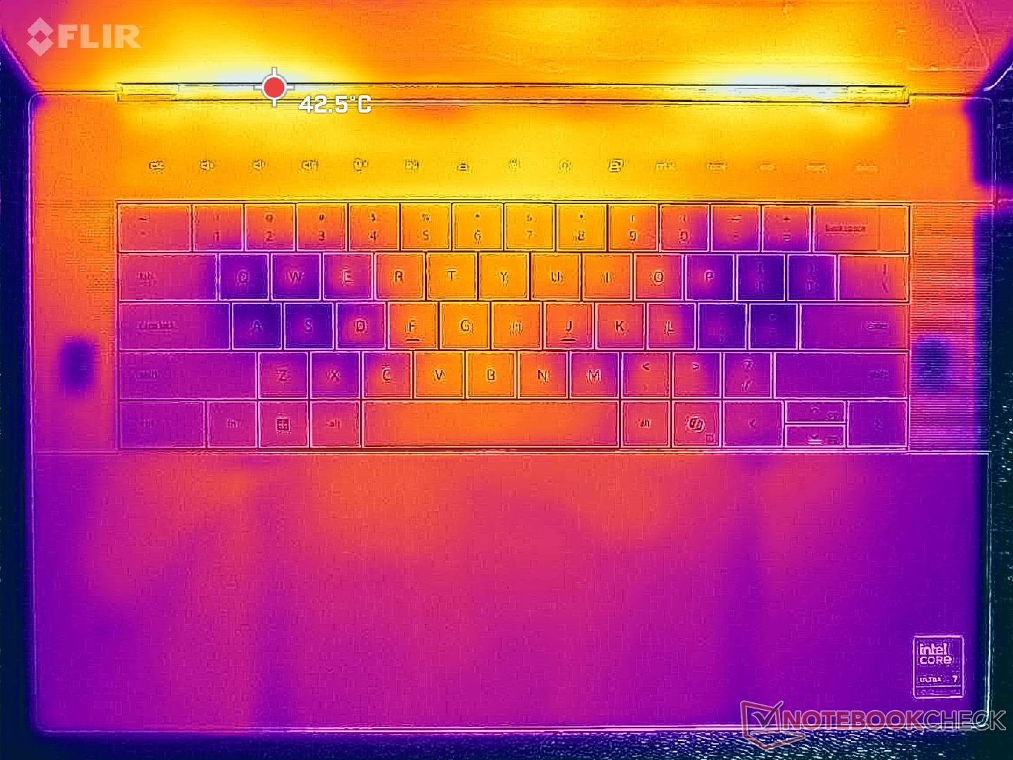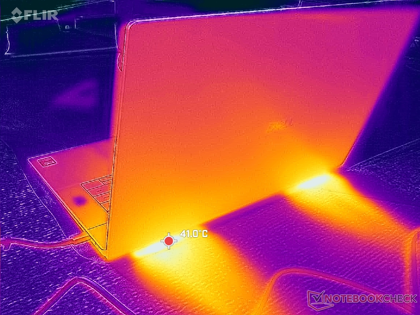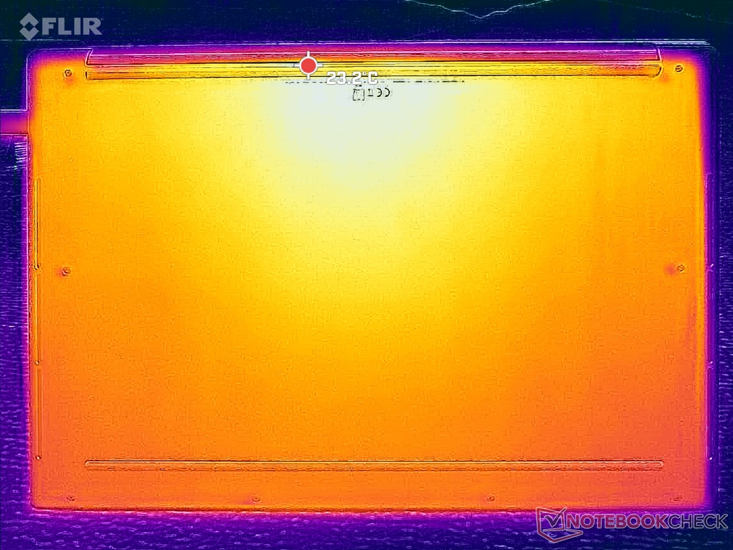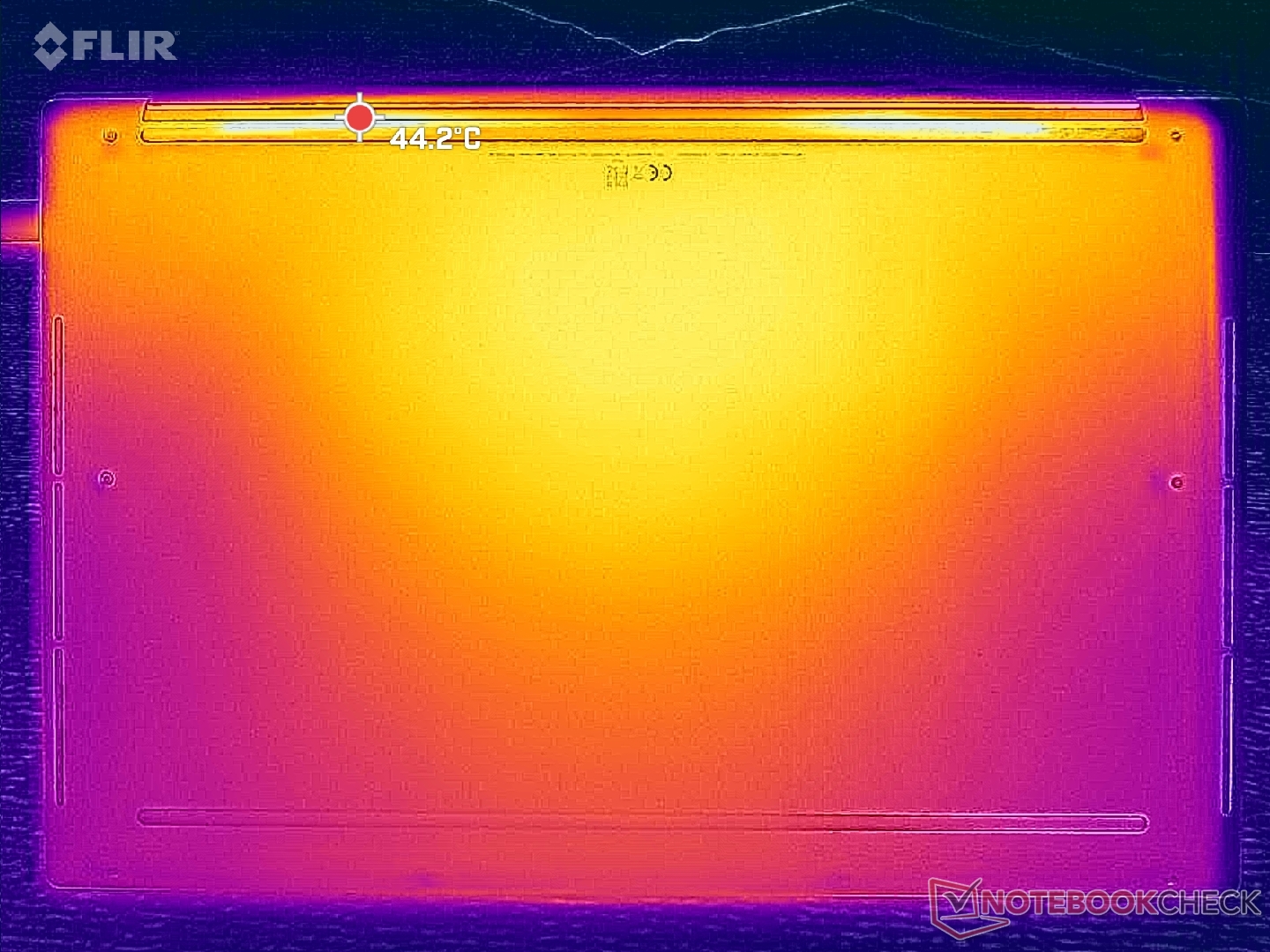 Los puntos calientes en la cubierta inferior cerca de las rejillas de ventilación pueden alcanzar casi 45 C cuando se ejecutan cargas exigentes. No podemos evitar preguntarnos si unos orificios de ventilación adicionales habrían mejorado las temperaturas generales, pero Dell está dando claramente prioridad a un diseño visual más limpio y sin orificios de ventilación, al estilo de la serie MacBook.