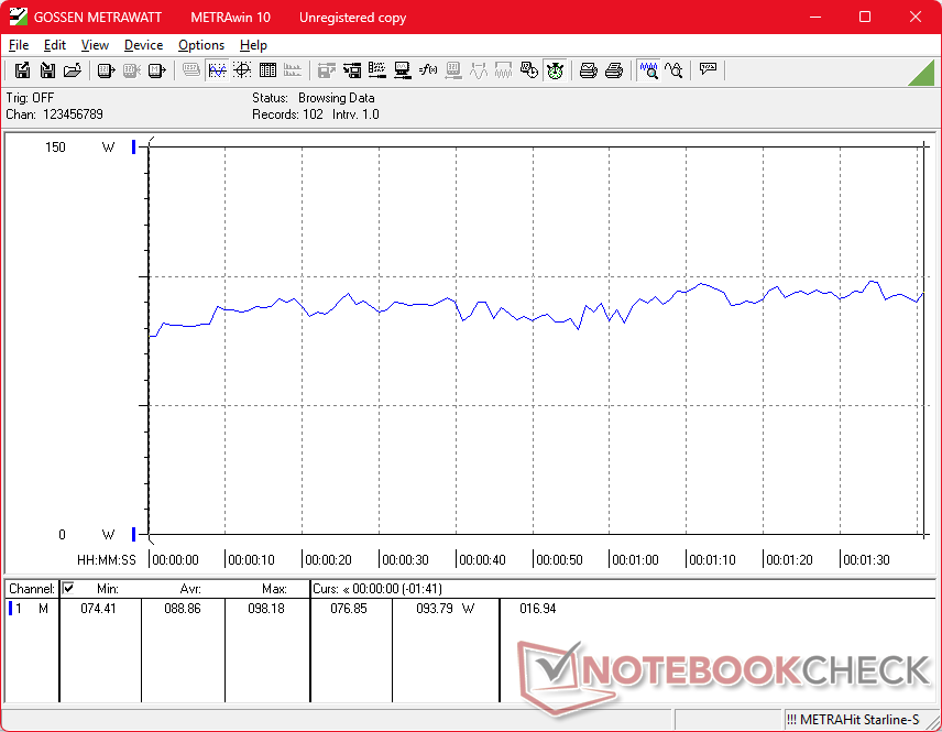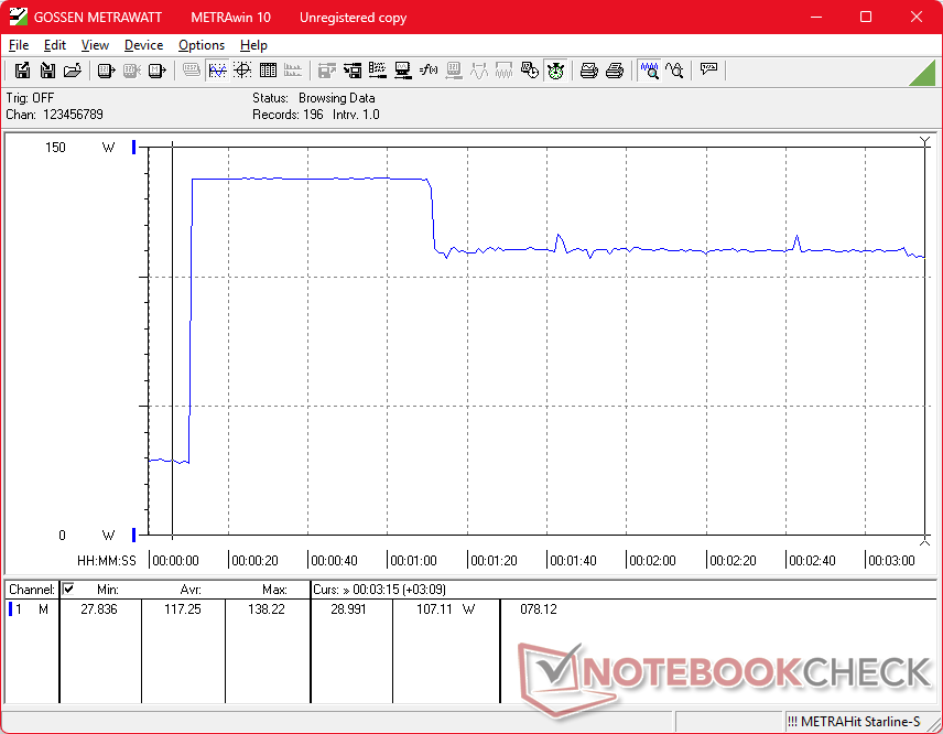 El funcionamiento en ralentí en el escritorio puede consumir tan solo 6 W en el modo de ahorro de energía con la iGPU activa o hasta 33 W en el modo de rendimiento con la dGPU activa y la pantalla OLED mostrando principalmente colores blancos (como cuando se navega). Por lo demás, el consumo cuando se ejecutan cargas más exigentes es similar al del modelo del año pasado, si no ligeramente inferior para mejorar el rendimiento por vatio, especialmente porque el Dell 16 Premium se entrega con el mismo adaptador de CA USB-C de 130 W (~12,8 x 5,5 x 2,3 cm) que antes.