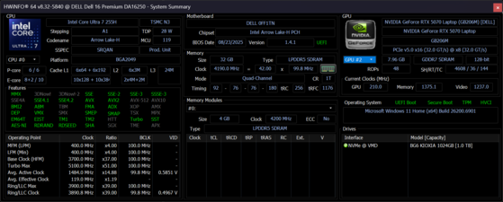 | Dell 16 Premium DA16250 Intel Core Ultra 7 255H ⎘ NVIDIA GeForce RTX 5070 Laptop ⎘ 32 GB Memoría, 1024 GB SSD | Amazon: $3,599.00 Precio de catálogo: 3300 USD | 2.3 kg | 18.7 mm | 16.30" 3840x2400 278 PPI OLED | |