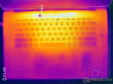 Las temperaturas del Surface son más bajas de lo esperado en comparación con otros portátiles equipados con CPU Core serie H y GPU RTX GeForce similares. El competidorMSI Creator Z17de la competencia, por ejemplo, tendría puntos calientes de hasta 60+ C mientras que nuestro Dell sólo llegaría a los 43 C con cargas pesadas similares. Las temperaturas superficiales más bajas del Dell pueden atribuirse al refrigerador de cámara de vapor, el aislamiento térmico GORE y, en general, la menor potencia disponible.