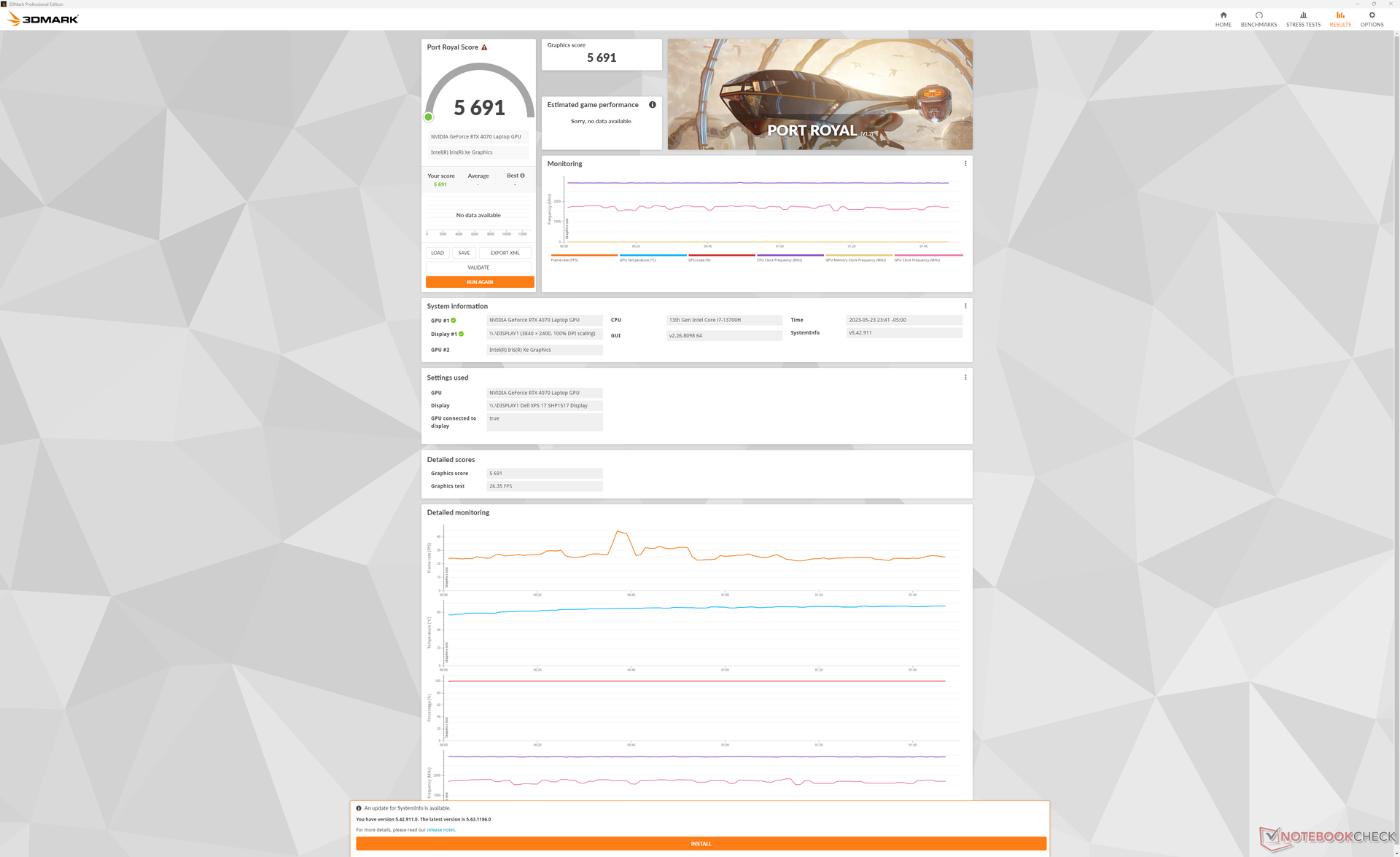 | 90 % v7 (old) | 05/2023 | Dell XPS 17 9730 RTX 4070 i7-13700H, GeForce RTX 4070 Laptop GPU | 2.5 kg | 19.5 mm | 17.00" | 3840x2400 | |