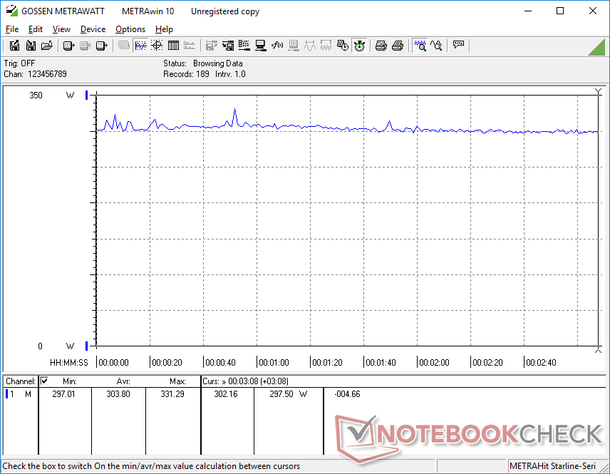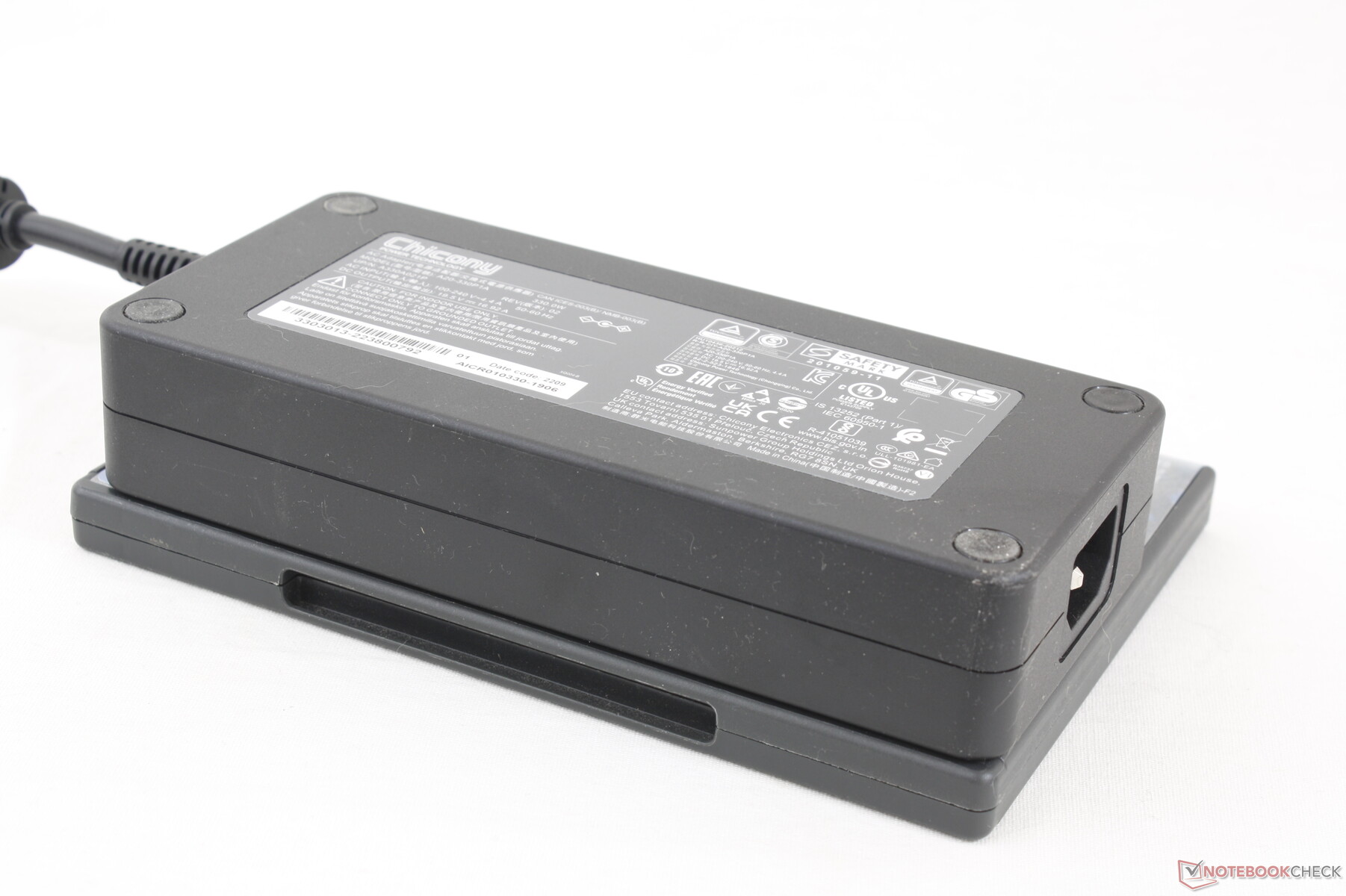 El adaptador de CA de 330 W es más grande que el adaptador de CA de 330 W del nuevo Razer Blade (~18,5 x 8,5 x 3,6 cm frente a ~18 x 7,5 x 2,5 cm) ya que Eluktronics y Uniwill aún no se han pasado a la carga GaN. Podemos registrar un consumo máximo temporal de 343 W cuando la CPU y la GPU están al 100% de uso.