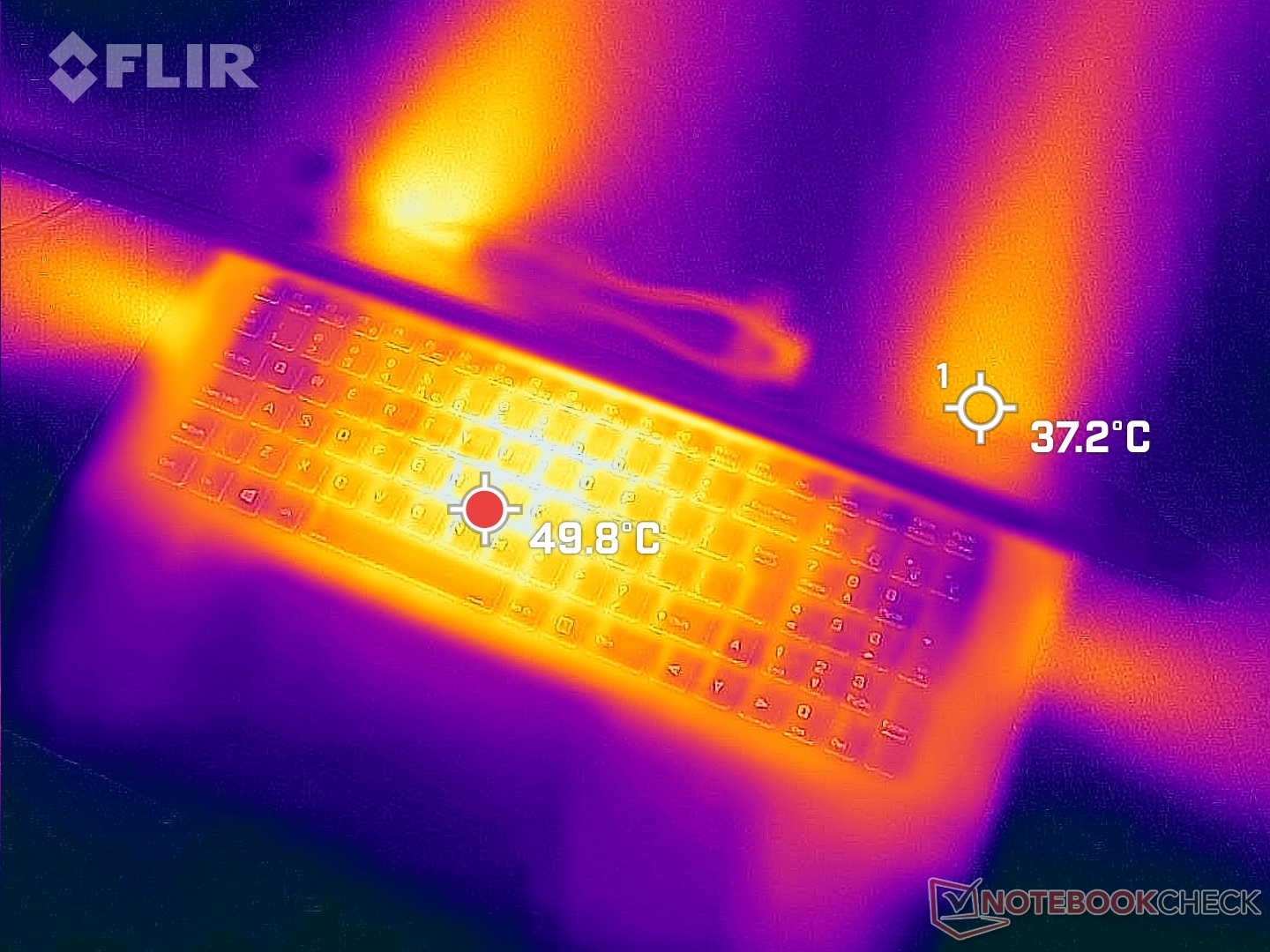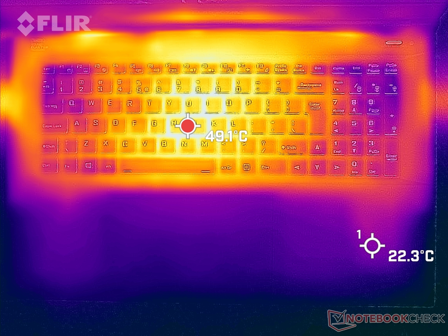 Las temperaturas de la superficie son más cálidas hacia el centro del teclado, mientras que los reposamanos son mucho más fríos para un juego más cómodo. Los portátiles más finos, como el Razer Blade 17 tienen reposamanos notablemente más calientes para ser más incómodos en la mano