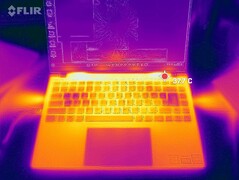 Con la CPU y la dGPU juntas produciendo hasta 75 vatios de calor residual, no sorprende que el pequeño Gigabyte Aero 14 OLED se caliente significativamente con el tiempo. Tras una hora de pruebas de estrés, sólo el touchpad se mantuvo por debajo de los 30 °C. La parte inferior del portátil se calienta hasta los 52 °C. Dado que la unidad base está hecha enteramente de aluminio, esta temperatura parece incómodamente alta. Por otro lado, el portátil casi siempre permanece a temperatura ambiente durante carga baja o inactivo.