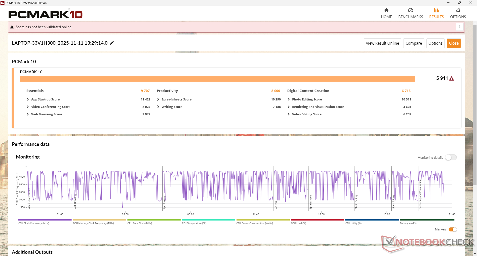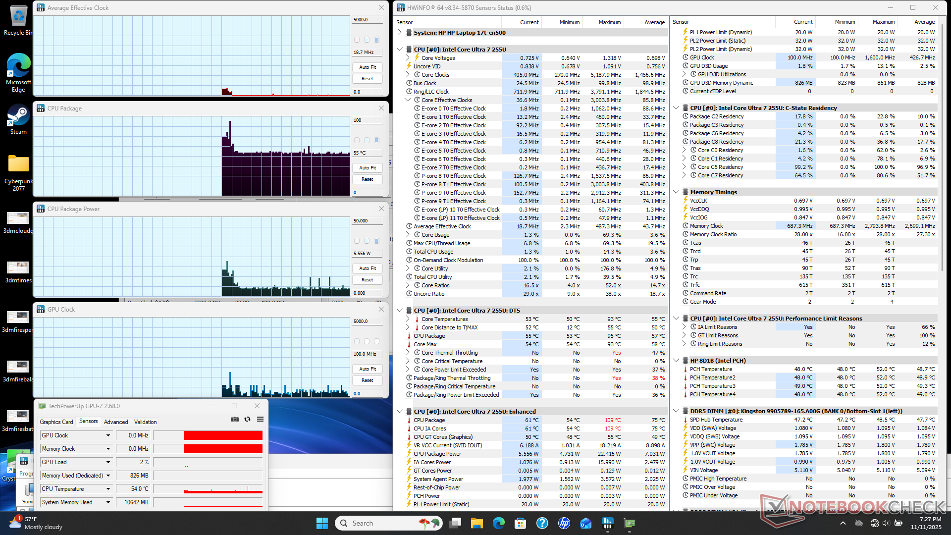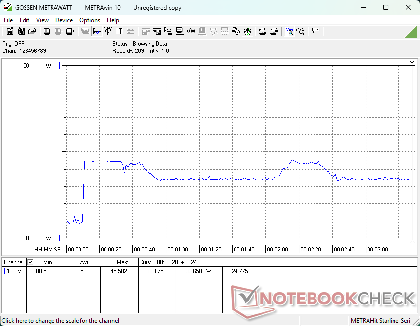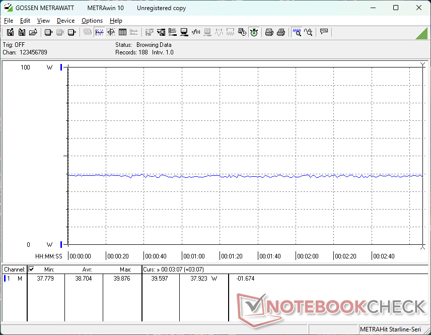 El HP 17t funciona con la misma potencia de 45 W que el HP 17 2020 pero con un rendimiento mucho más rápido para un rendimiento por vatio significativamente mejorado. Por ejemplo, ambos sistemas consumen alrededor de 40 W cada uno cuando se juega aunque el 17t puede rendir entre un 80 y un 150 por ciento más rápido dependiendo del título.