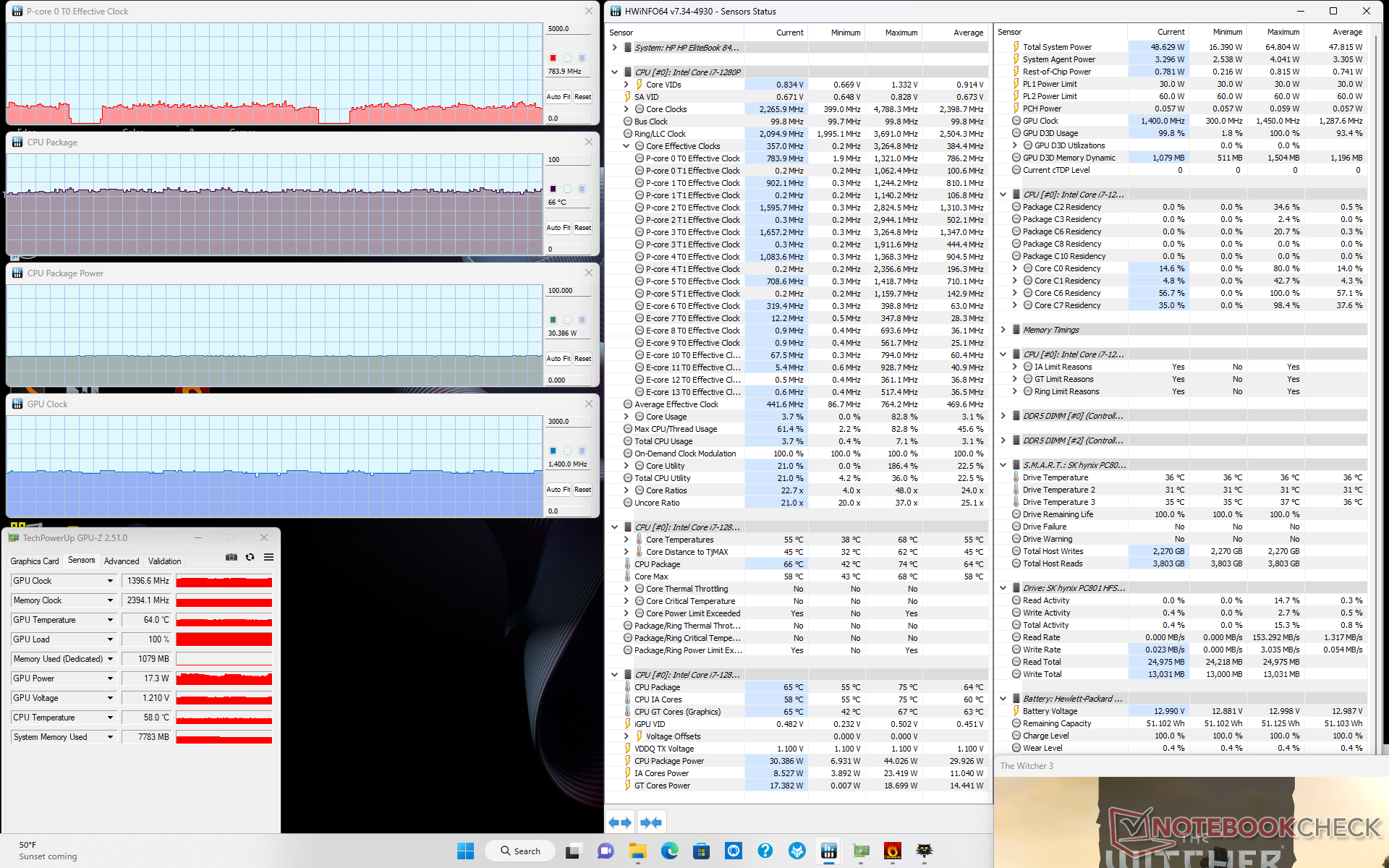 Las frecuencias de reloj de la GPU y la temperatura en funcionamiento Witcher 3 se estabilizan en 1397 MHz y 66 C, respectivamente, frente a los 1097 MHz y 65 C del Dragonfly Folio G3 equipada con la misma GPU integrada. Las mayores frecuencias de reloj ayudan a situar al EliteBook por encima de la mayoría de portátiles con Core U en lo que a rendimiento gráfico se refiere.