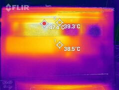 En reposo, el portátil apenas se calienta por encima de la temperatura ambiente. Bajo carga, un punto caliente se desarrolla en el centro delante de la pantalla, que luego se expande hacia el teclado, alcanzando temperaturas cercanas a la marca de 50°C (122 °F). Aunque este calentamiento se nota al teclear, no llega a ser demasiado incómodo.