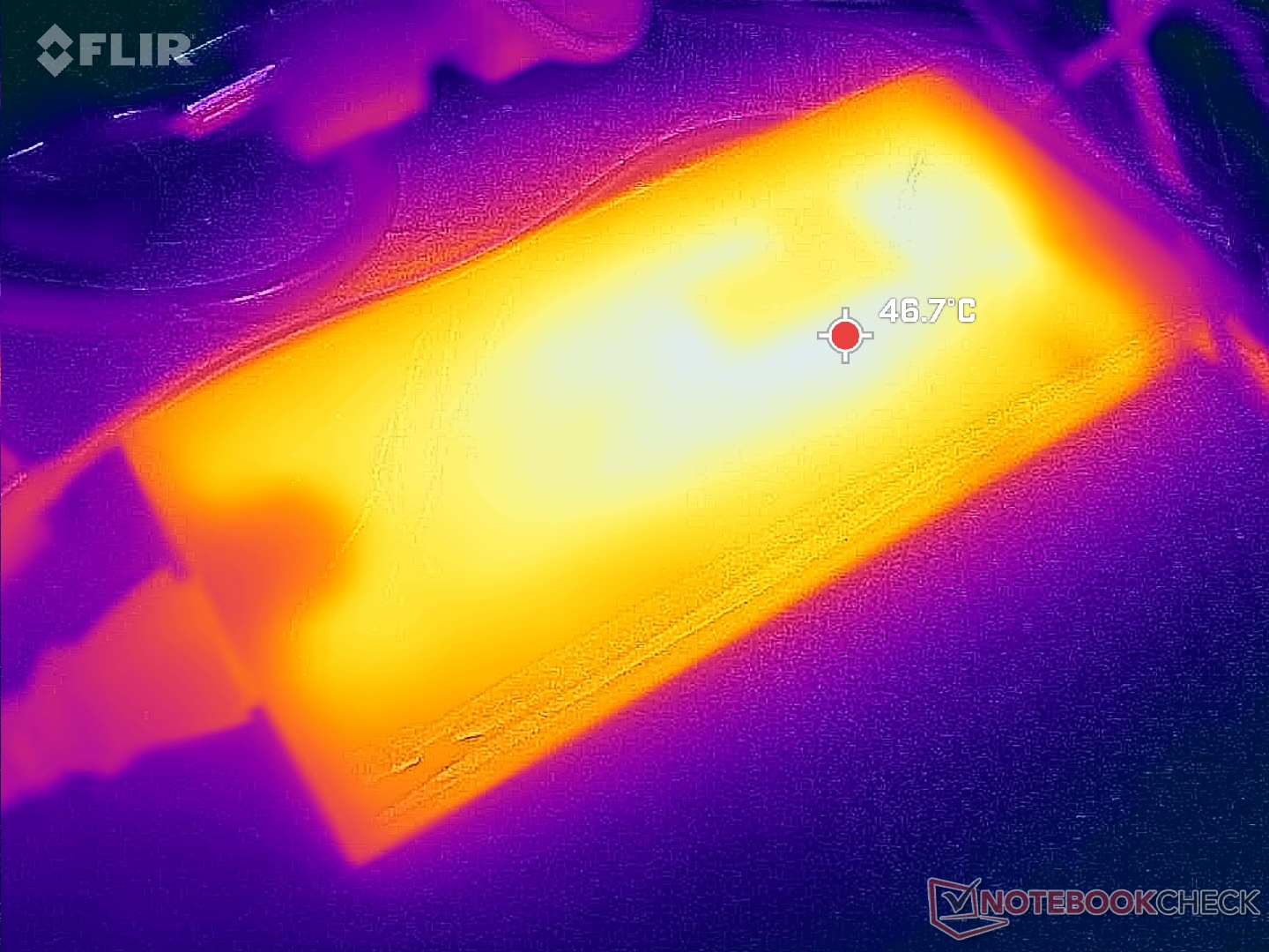 (-) La temperatura máxima en la parte superior es de 47.4 °C / 117 F, frente a la media de 40.4 °C / 105 F, que oscila entre 21.2 y 68.8 °C para la clase Gaming.