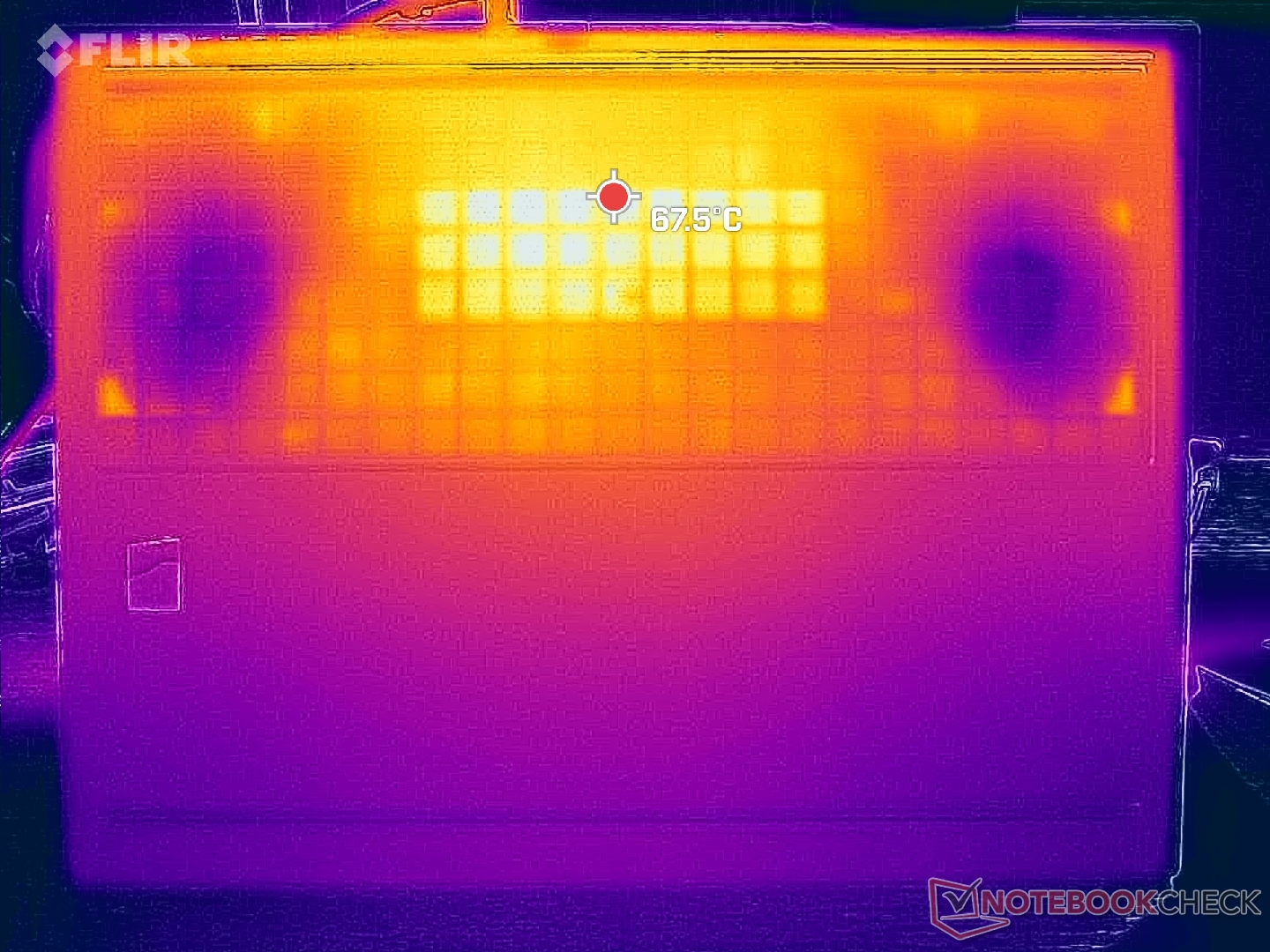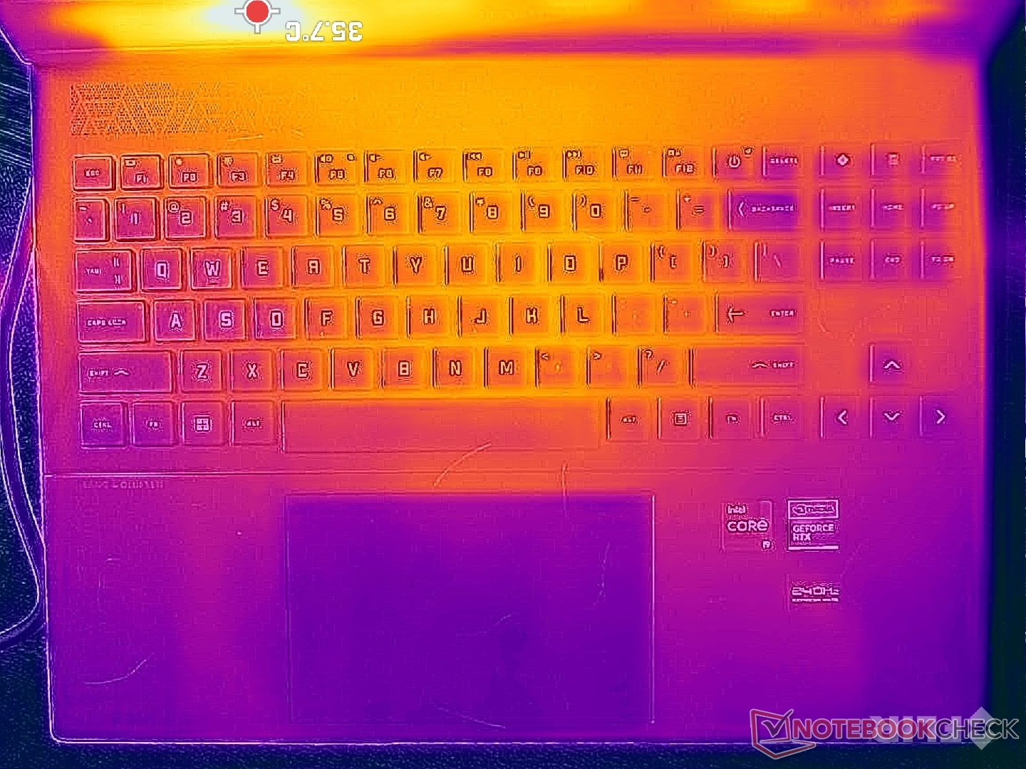 Las temperaturas de la superficie son más cálidas hacia el centro debido a la solución de refrigeración simétrica del interior. El centro del teclado puede alcanzar entre 40 y 45 C cuando se juega y la parte inferior puede ser incluso más cálida. Sin embargo, este rango sigue siendo comparable al delLegion Slim 7i 16 G8. El resto del portátil es más fresco, incluyendo los reposamanos, las teclas WASD y las teclas de flecha, donde la piel está más a menudo en contacto cuando se juega.