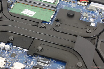 El panel inferior se sujeta con sólo seis tornillos Phillips para facilitar el acceso. Un cambio notable del Omen 16, sin embargo, es la eliminación de la segunda ranura M.2 SSD debido a la ranura M.2 WLAN reposicionada como se muestra en las imágenes de comparación a continuación. Por lo tanto, el Omen Transcend 16 sólo puede soportar hasta un SSD interno en lugar de dos. También se han realizado otros ajustes menores en los altavoces y la solución de refrigeración.