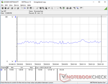 Pudimos registrar un consumo máximo de 292 W con el adaptador de CA mediano-grande (~18 x 8.7 x 2.6 cm) de 280 W cuando la CPU y la GPU están al 100% de uso. El consumo se estabilizaría en el rango de los 240 W tras aproximadamente un minuto de estrés total.