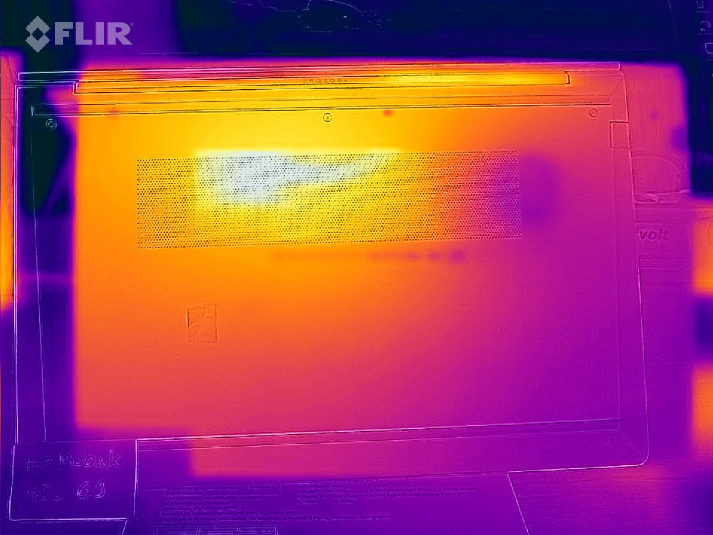 Las superficies del ProBook 450 G9 permanecen frías al tacto incluso bajo carga prolongada. Sólo una zona inferior cercana a la CPU se calienta bastante, con 47,6 °C, mientras que el ThinkPad E15 G3 AMDpor ejemplo, supera los 60 °C en una sección específica de la parte inferior. Además, el Dell Inspiron 15 Plus de Dell y el IdeaPad 5 Pro 16 les gusta un poco más de calor.