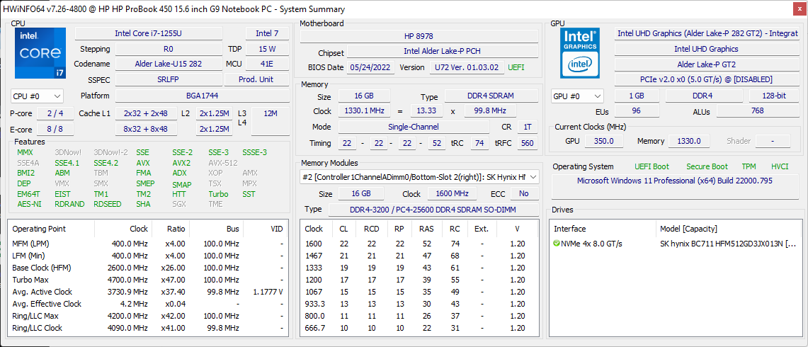 El Core i7-1255U de Intel demuestra ser algo eficiente en términos de energía en el ProBook 450, lo que resulta en una mayor duración de la batería. La razón es muy sencilla: Alder Lake-U sólo tiene dos núcleos de rendimiento, mientras que Alder Lake-P dobla o incluso triplica este número. Por lo tanto, la proporción se desplaza bruscamente hacia los núcleos de eficiencia, de los cuales hay ocho en ambos casos.