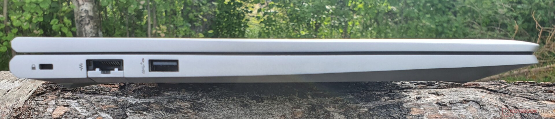Situado en el lado izquierdo del dispositivo, nos alegra ver un puerto LAN, aunque esté especificado a sólo 1 GBit/s. Justo al lado se encuentra un puerto USB-A 3.1 Gen 1 (5 GBit/s), mientras que todos los demás puertos están a la derecha: Dos USB-A 3.1 Gen 1 adicionales, un HDMI 1.4b, la clavija de audio de 3.5 mm, una ranura SIM falsa (ranura adecuada sólo para los modelos equipados con WWAN), el puerto de carga y un USB-C 3.2 Gen 2 (10 GBit/s) adecuado para cargar y conectar monitores externos vía DisplayPort 1.4.