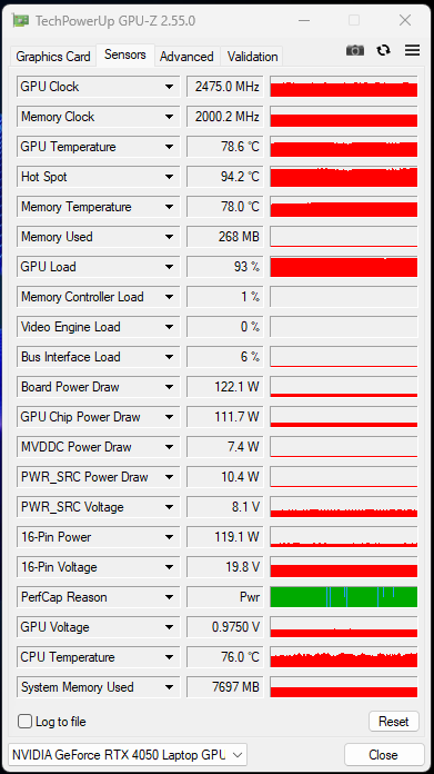 De forma similar, la GeForce RTX 4050 intenta mantener sus frecuencias a 2.580 MHz, pero al final se queda en 2.420 MHz, que entra dentro de las frecuencias de aceleración anunciadas por Nvidia. Se calienta un poco más que la CPU, con una temperatura media de 82,5 °C, gracias a los dos robustos ventiladores y a los conductos de calor que canalizan el calor a través de los orificios de ventilación.