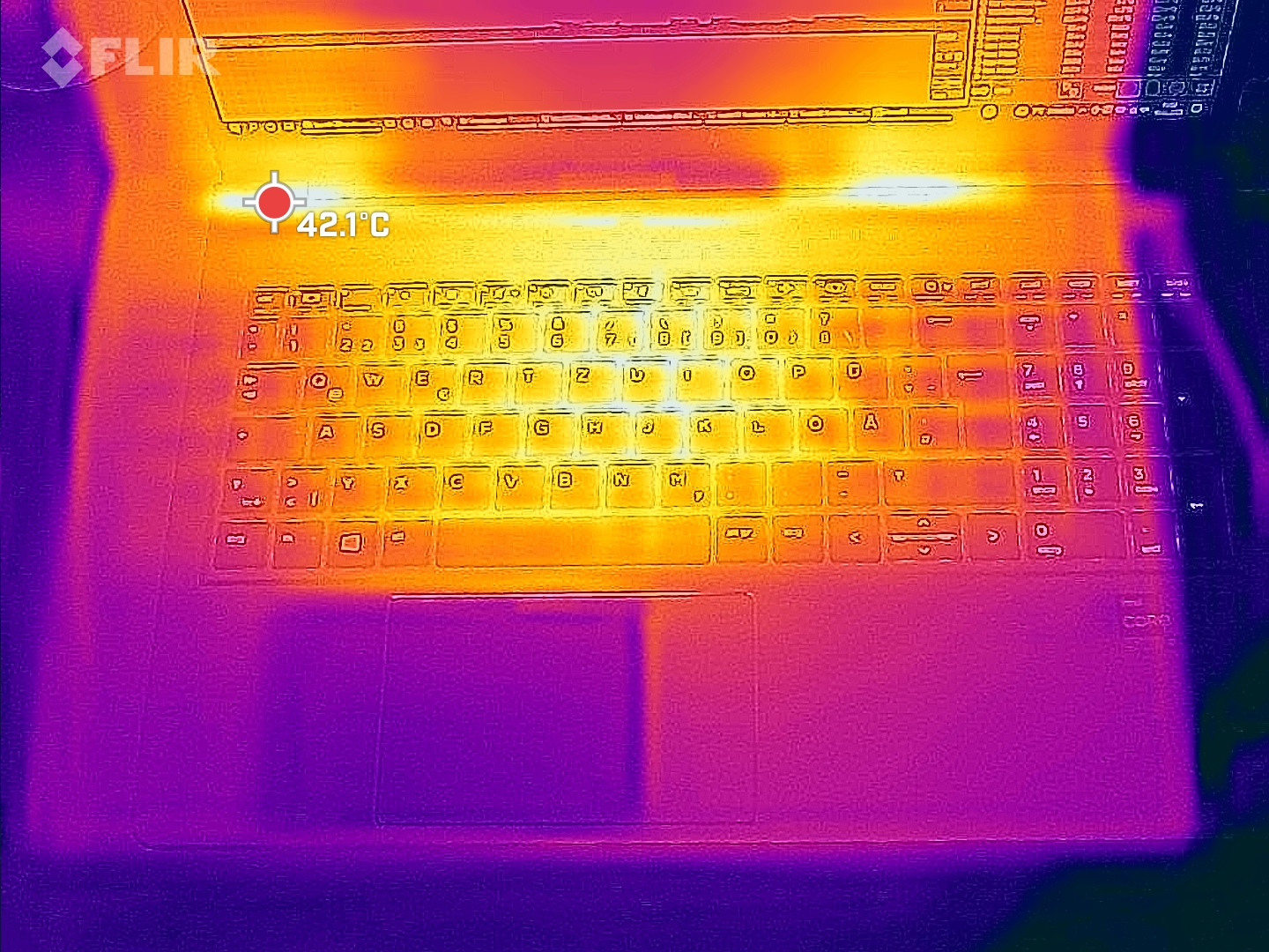 Los únicos puntos más calientes están en el centro sobre el teclado así como en el lugar correspondiente en el fondo de la carcasa, y eso sólo durante la prueba de estrés. Sin embargo, ya que los ventiladores no se aceleran tanto, estos puntos calientes son notables incluso durante el juego o mientras se renderiza, e incluso en el centro del teclado. Pero nunca se calientan de forma molesta.