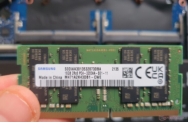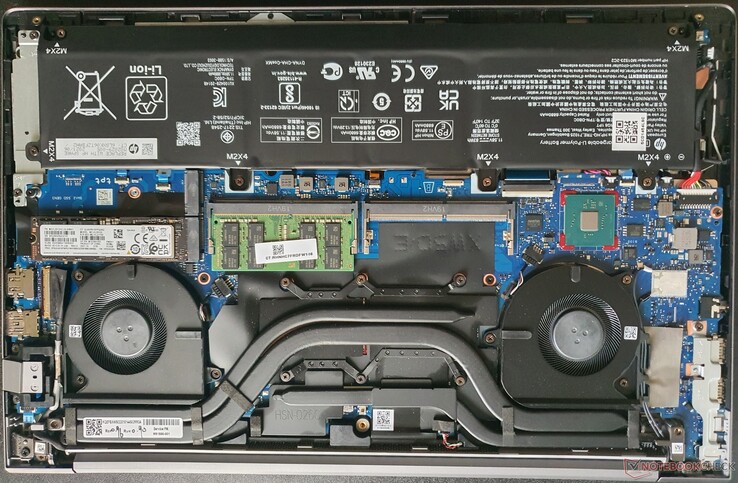 Después de quitar sólo cinco tornillos Philips, el fondo de la carcasa se puede quitar fácilmente usando una herramienta de palanca de plástico. De este modo, se obtiene acceso a 2x DIMMs SO y 2x ranuras M.2-2280, mientras que la batería también es reemplazable y se puede mantener el sistema de refrigeración atornillado. El módulo WLAN está soldado, y el teclado también es fijo. No hay WWAN.